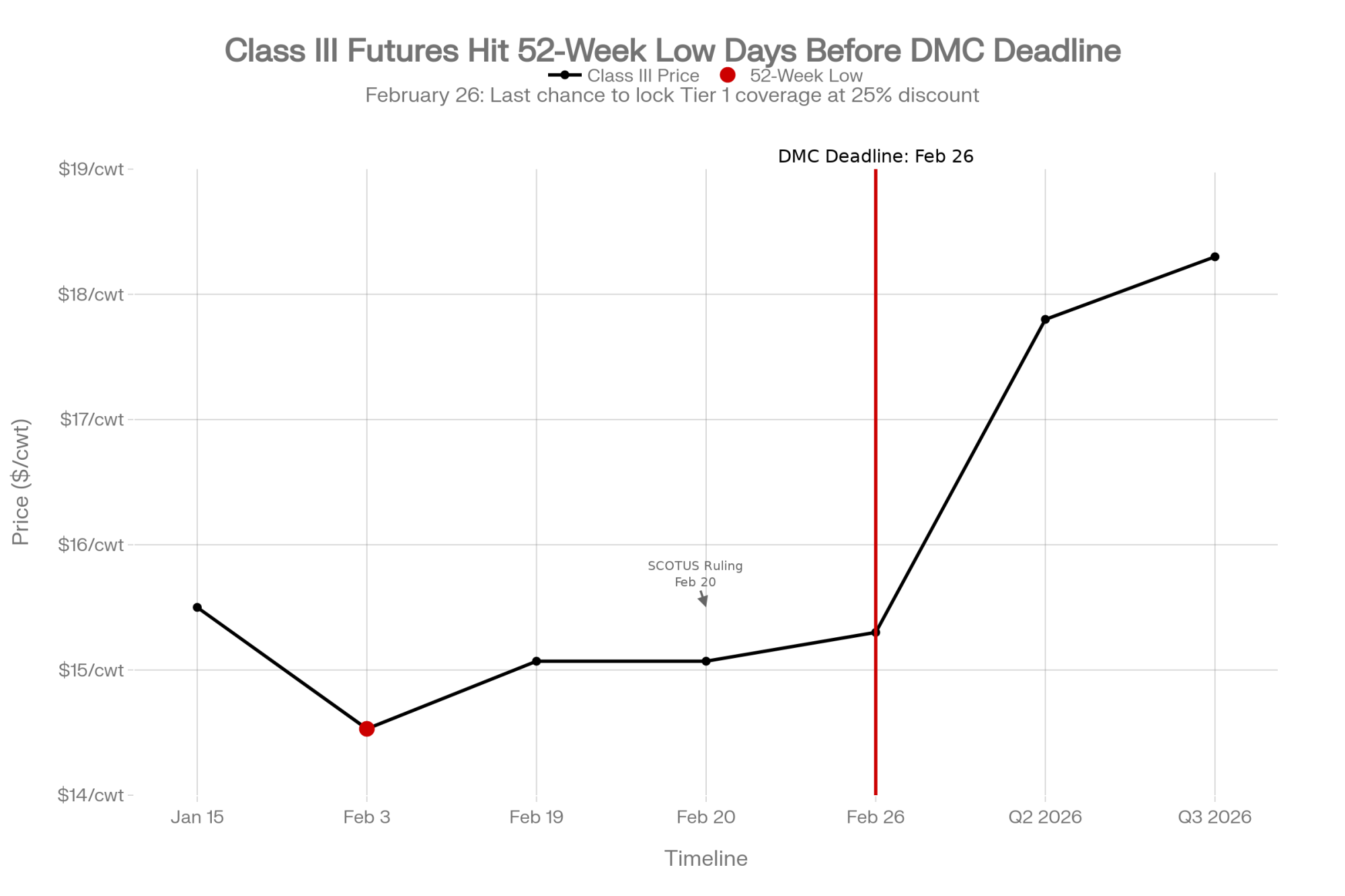 | Next 30 Days (Now – Mar 24) | DMC 2026 enrollment | Lock in Tier 1 coverage (6M lbs) at 25% discount for 2026–2031 | Miss expanded coverage; pay higher premiums in 2027 | Class III Feb 3 low: $14.53/cwt |