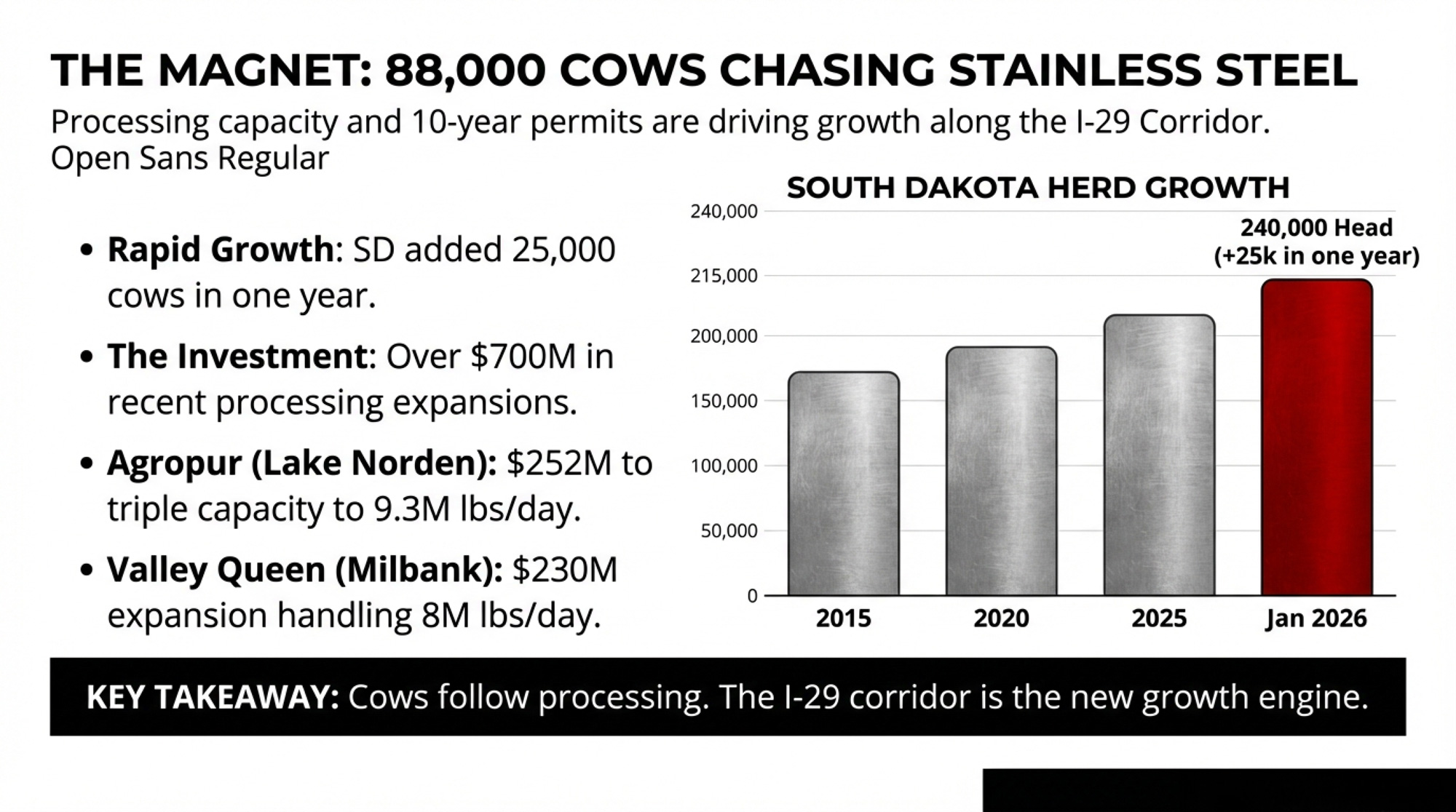 - South Dakota’s dairy herd hit 240,000 cows as of January 1, 2026, adding 25,000 head in a single year — exactly matching Grong’s projection, built on 10-year CAFO permits, reinvestment incentives, and nine-figure processor expansions.