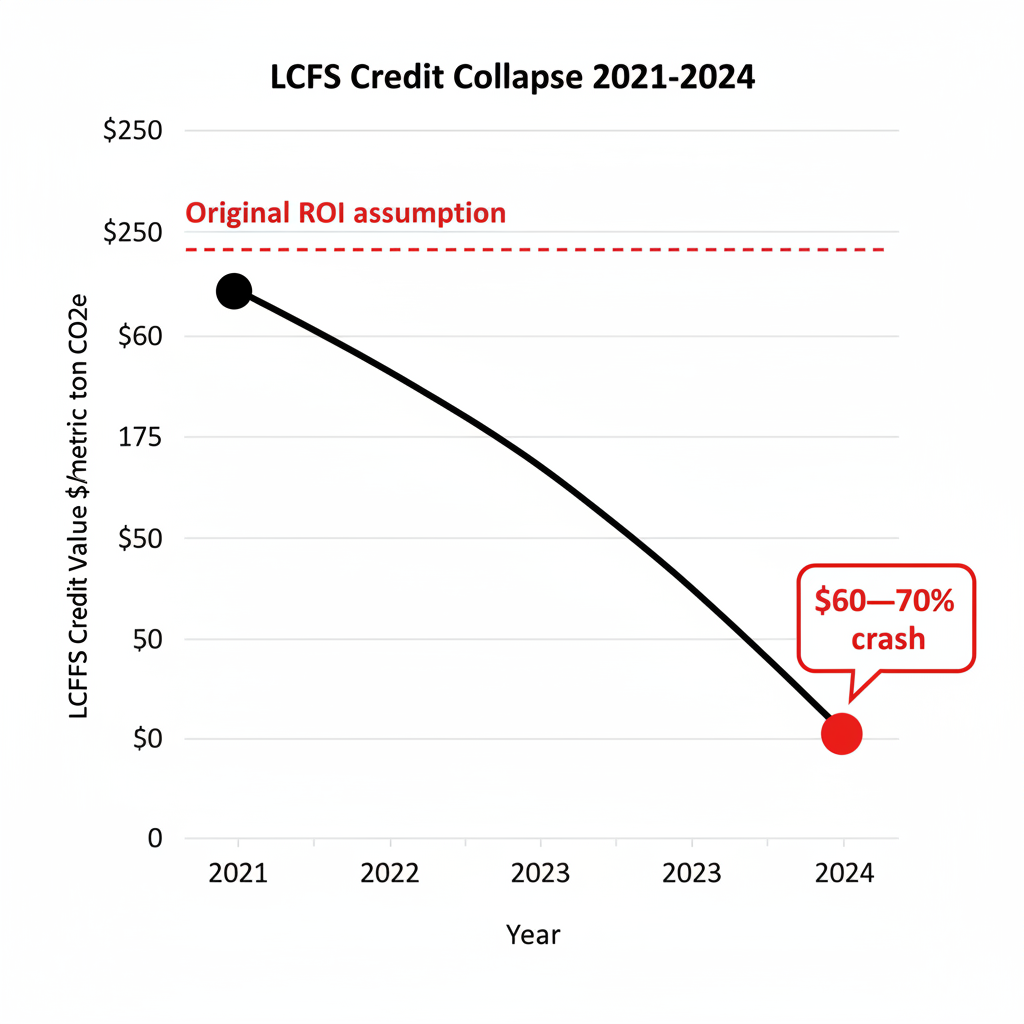 | Digester Economics | N/A (not required) | $6M+ per unit; LCFS credits crashed from $200 to ~$60/MT (2021–2024) |