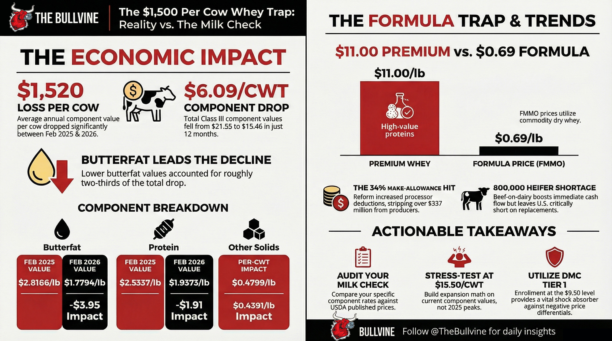 Executive Summary: Your component check dropped about $1,520 per cow from February 2025 to February 2026 while premium whey climbed to $11/lb and plants poured $11 billion into new cheese and whey capacity. FMMO’s new make‑allowance formula now prices other solids off 69‑cent dry whey and higher processor costs, cutting roughly 24¢/cwt from your other‑solids line even as whey markets rally. Butterfat and protein did the rest of the damage, taking total Class III components down about $6.09/cwt — a $450K‑plus swing on a 300‑cow herd. At the same time, beef‑on‑dairy calves are throwing off $500–$800/head, helping cash flow but leaving the U.S. roughly 800,000 heifers short heading into a capacity build‑out. The article walks through barn‑level scenarios if whey and cheese both correct, including how negative PPDs could stack another $1–$2/cwt on top of what you’ve already lost. Then it lays out a 30/90/365‑day playbook: audit your component line against AMS values, stress‑test your DMC and DRP coverage, and rebuild any expansion math around ~$15.50/cwt components instead of 2025 peaks. If you’ve got 200–500 cows on a component order and you’re not sure how much of that $11/lb whey is in your milk check, this is the 10‑minute read to run before your next contract or barn decision.
