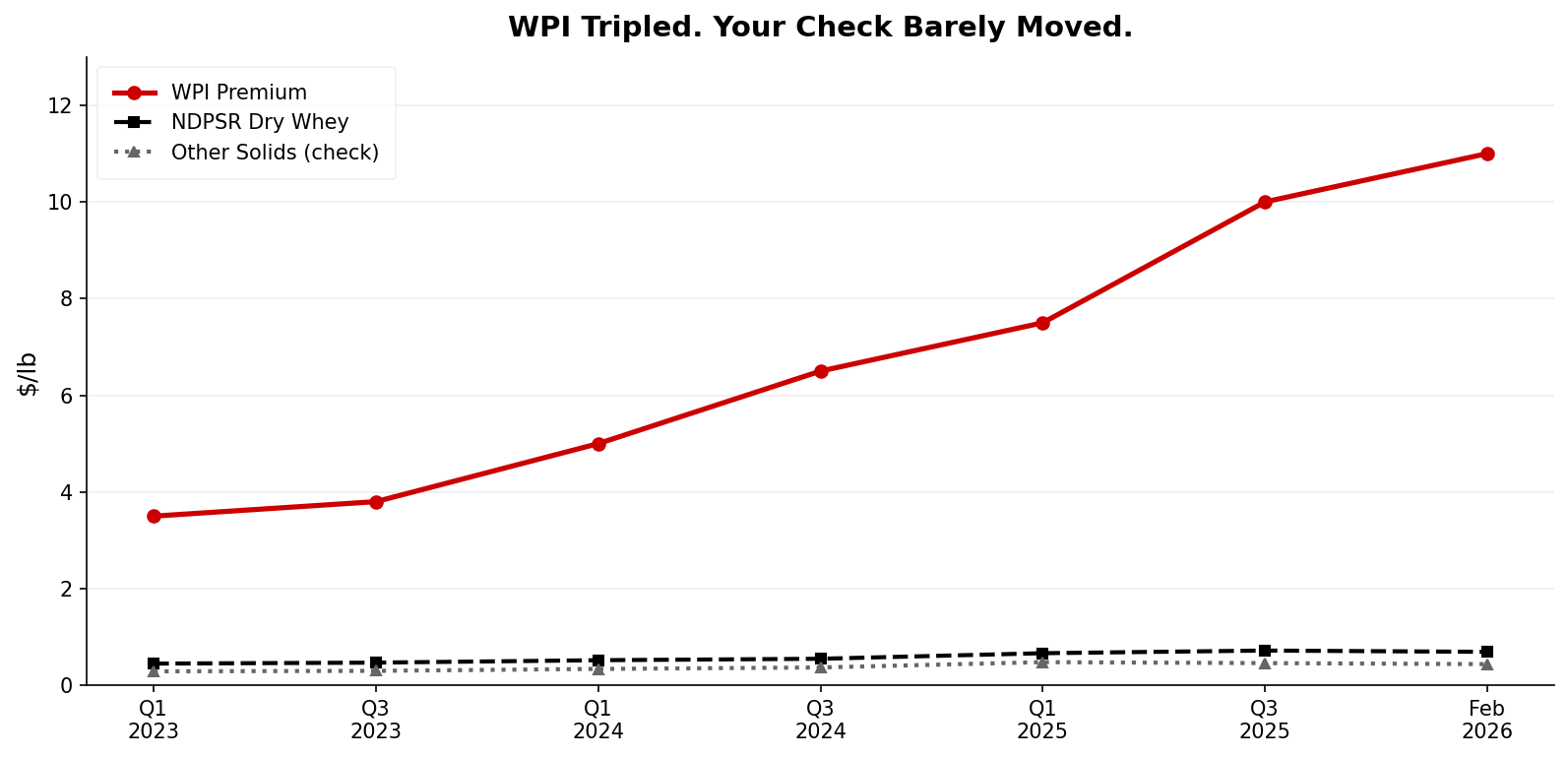 Every pound of WPI starts as your cow’s milk going through a cheese vat. The FMMO formula turns that into $0.4391/lb of other solids. The plant’s ingredient desk sells that same stream at several dollars per pound.