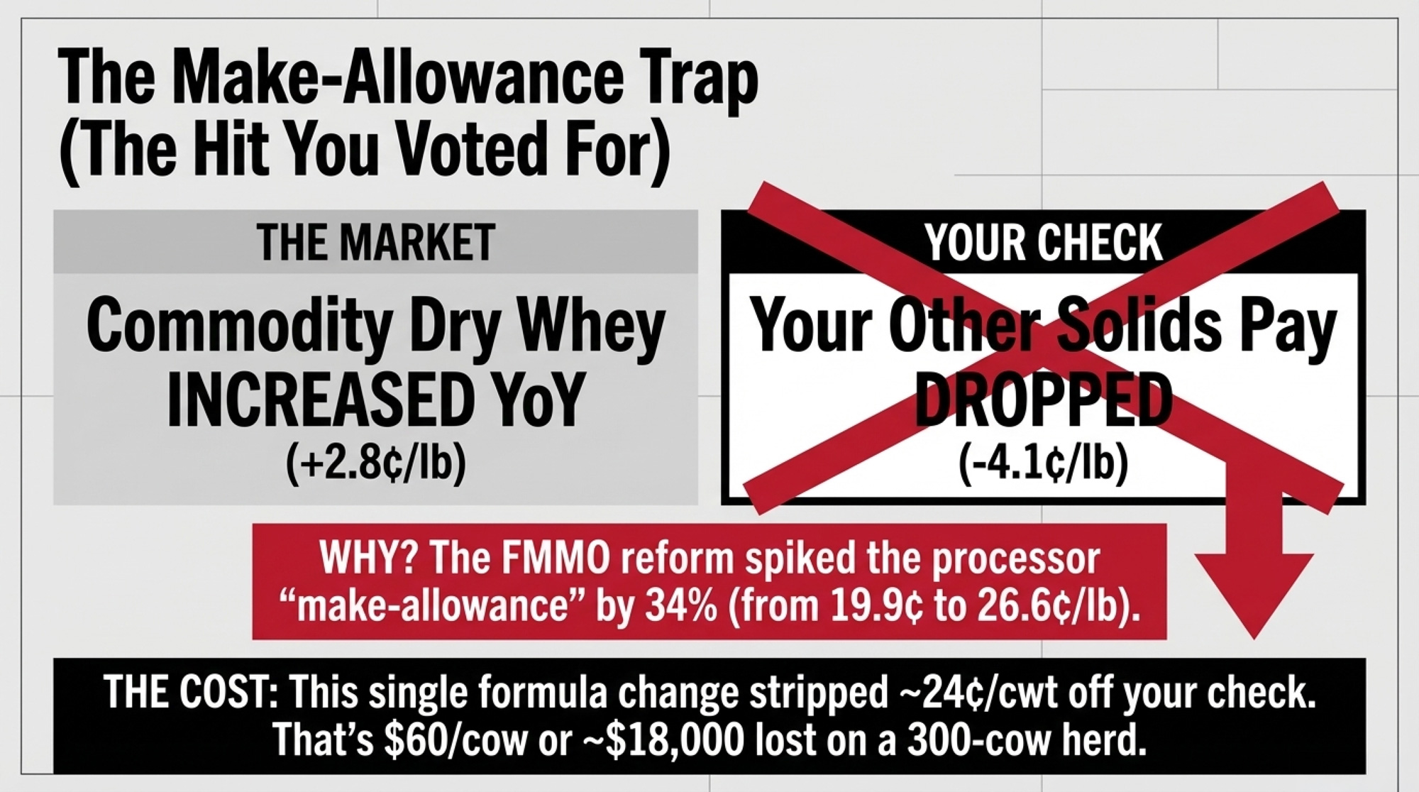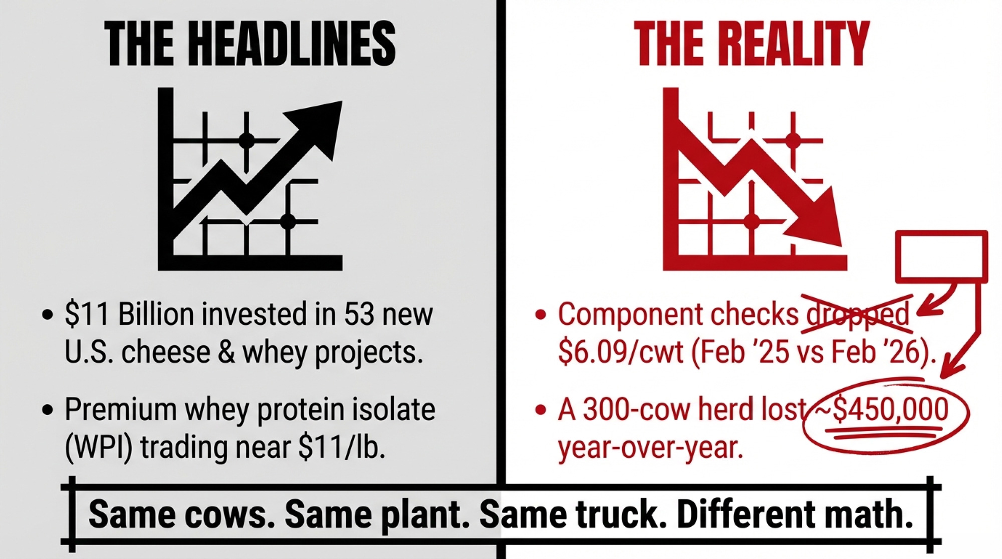 $11/lb whey. 69¢ on your milk check. We ran the FMMO barn math on a 300‑cow herd to see where the other $1,500 per cow actually went.