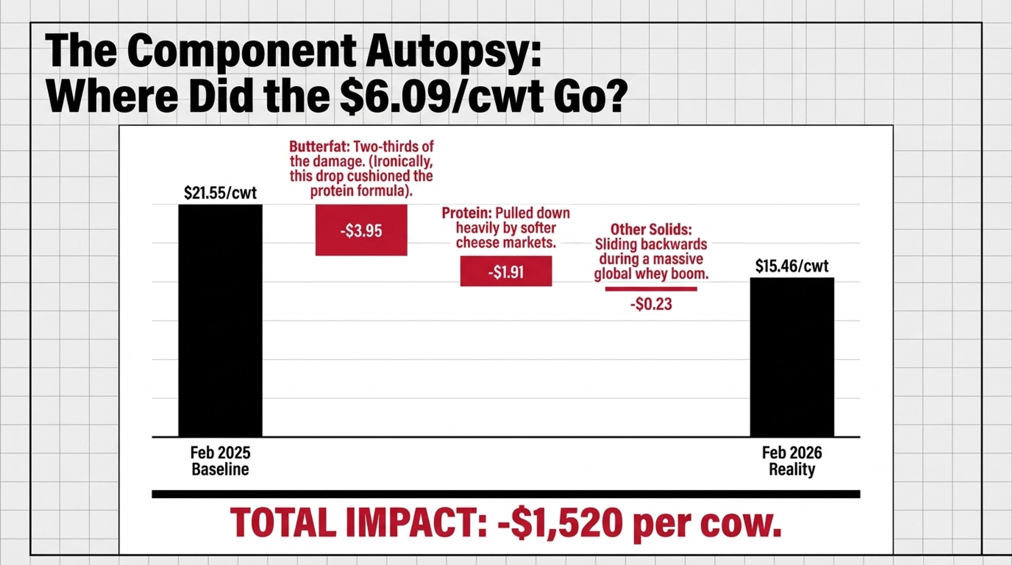 - Your component check has already absorbed roughly $1,520/cow from February 2025 to February 2026 — about $456,000 on 300 cows. If your expansion budget or debt‑service math is built on early‑2025 component values, you’re building on a number that isn’t there anymore.