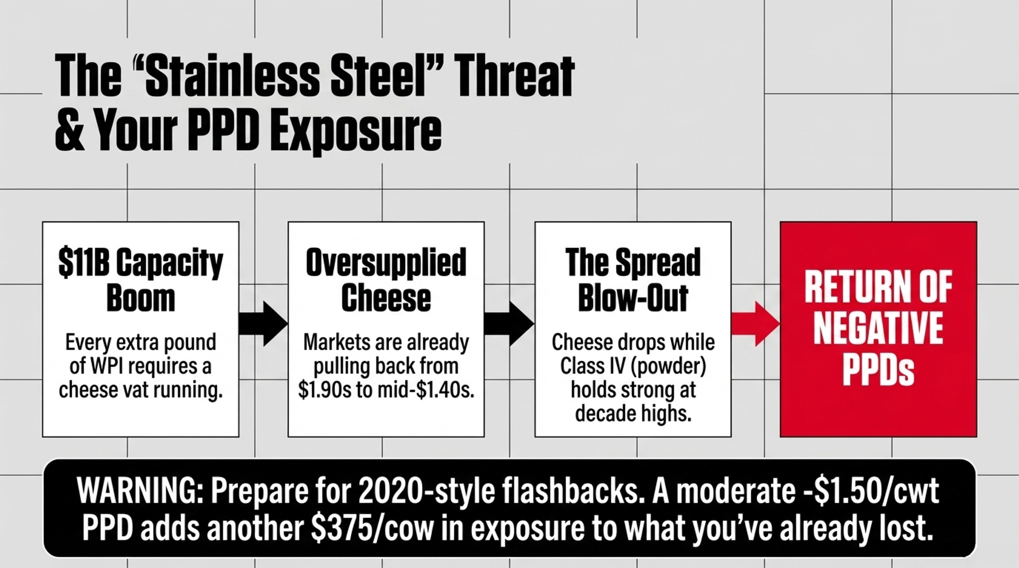 Now add the hidden multiplier: PPDs. If cheese drops while Class IV holds firm — CME nonfat dry milk has been trading at some of its strongest levels in more than a decade, near $1.94/lb in March 2026 — the spread blows out, and negative Producer Price Differentials come back. In 2020, some orders saw PPDs past −$4 to −$8/cwt. Even a moderate −$1.50/cwt PPD adds another ~$375/cow in exposure.