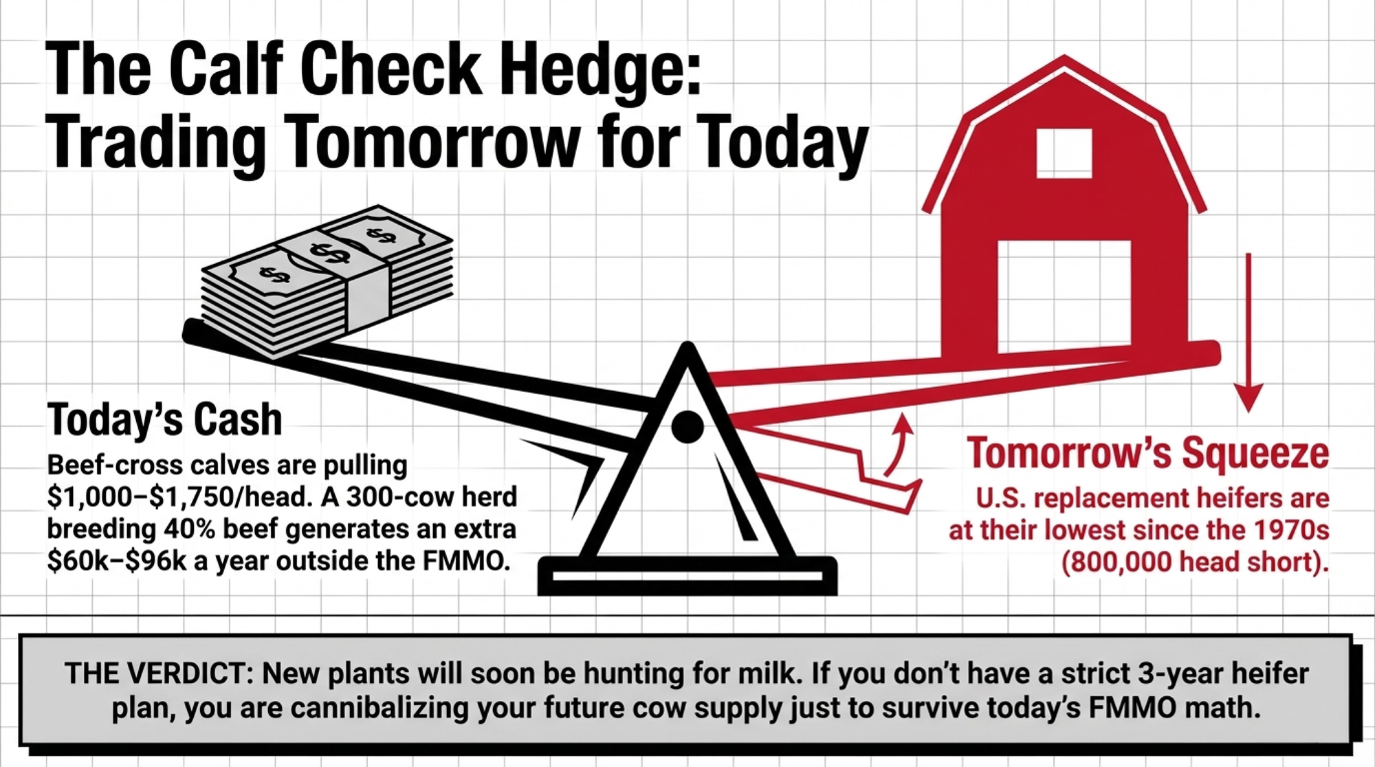 - Beef‑on‑dairy calves at $1,400–$1,750 are real margin, but they’re also tightening heifer supply in ways that make the coming milk bidding wars more brutal. Your beef‑to‑dairy AI ratio needs to line up with your three‑year heifer plan, not just this month’s calf check.