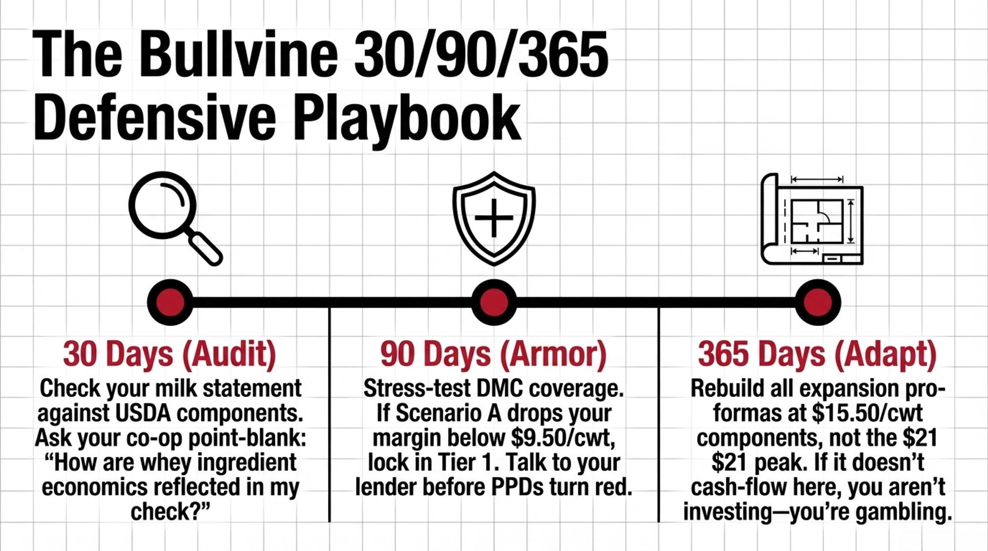 | 90 Days | Stress-test DMC coverage | Tier 1 at $9.50 (up to 6M lb) | Margin drops below $9.50 in Scenario A | USDA DMC / Center for Dairy Excellence |