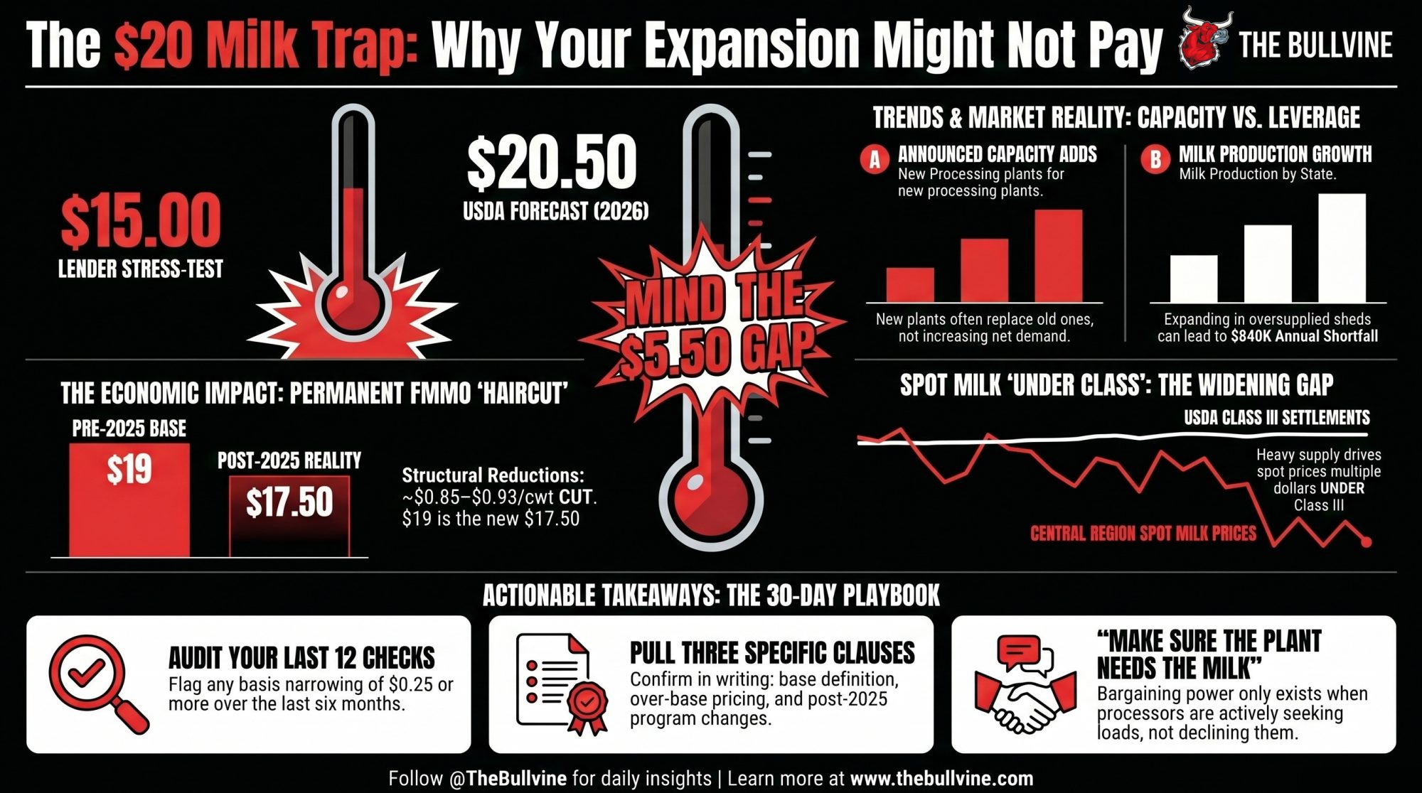 Bullvine’s “$19 Milk Trap” analysis from April 6, 2026, walked through the covenant‑pressure sequence in detail. This piece picks up where that one ended: what happens when the pro forma and the stress case sit $4 apart, and the 400 cows are your decision.