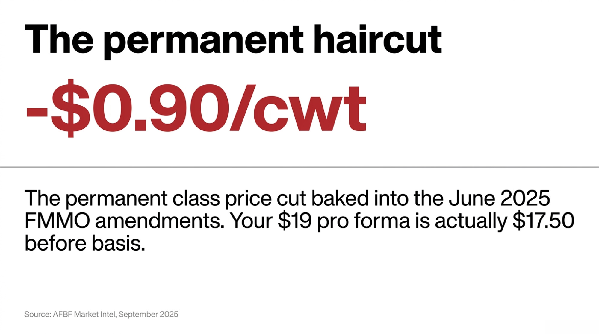 - The June 1, 2025, FMMO amendments cut class prices by roughly $0.85–$0.93/cwt, and that haircut is permanent. A $19 pro forma is really the new $17.50 before basis or premiums.