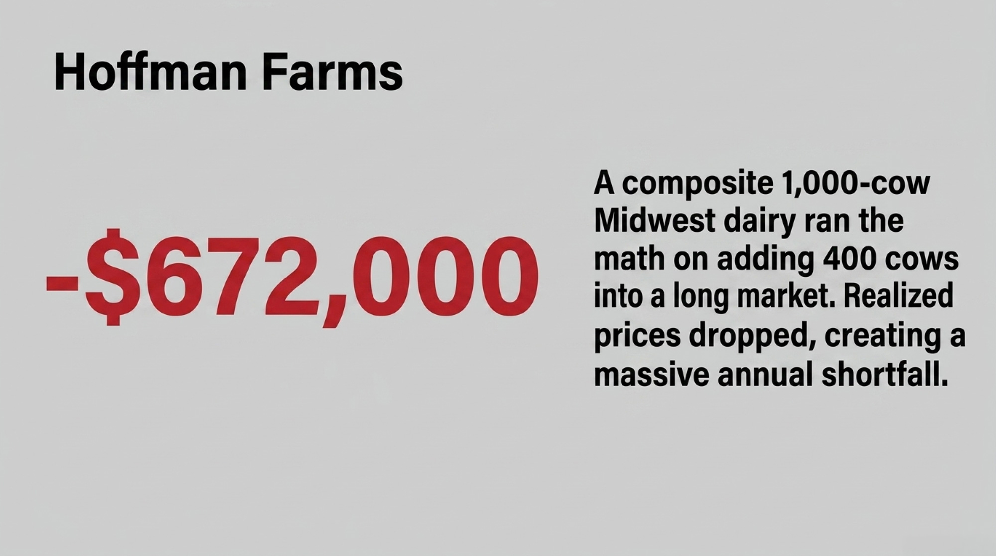In the composite Hoffman scenario, the plant sits on the commodity side of that split — a profile that fits a meaningful share of Central‑region facilities, though not all. Adding 400 cows into a long shed tied to a plant with no visible premium‑product trajectory isn’t growth. It’s volunteering to be the region’s balancing supply at the worst moment in the cycle to be the marginal hundredweight.