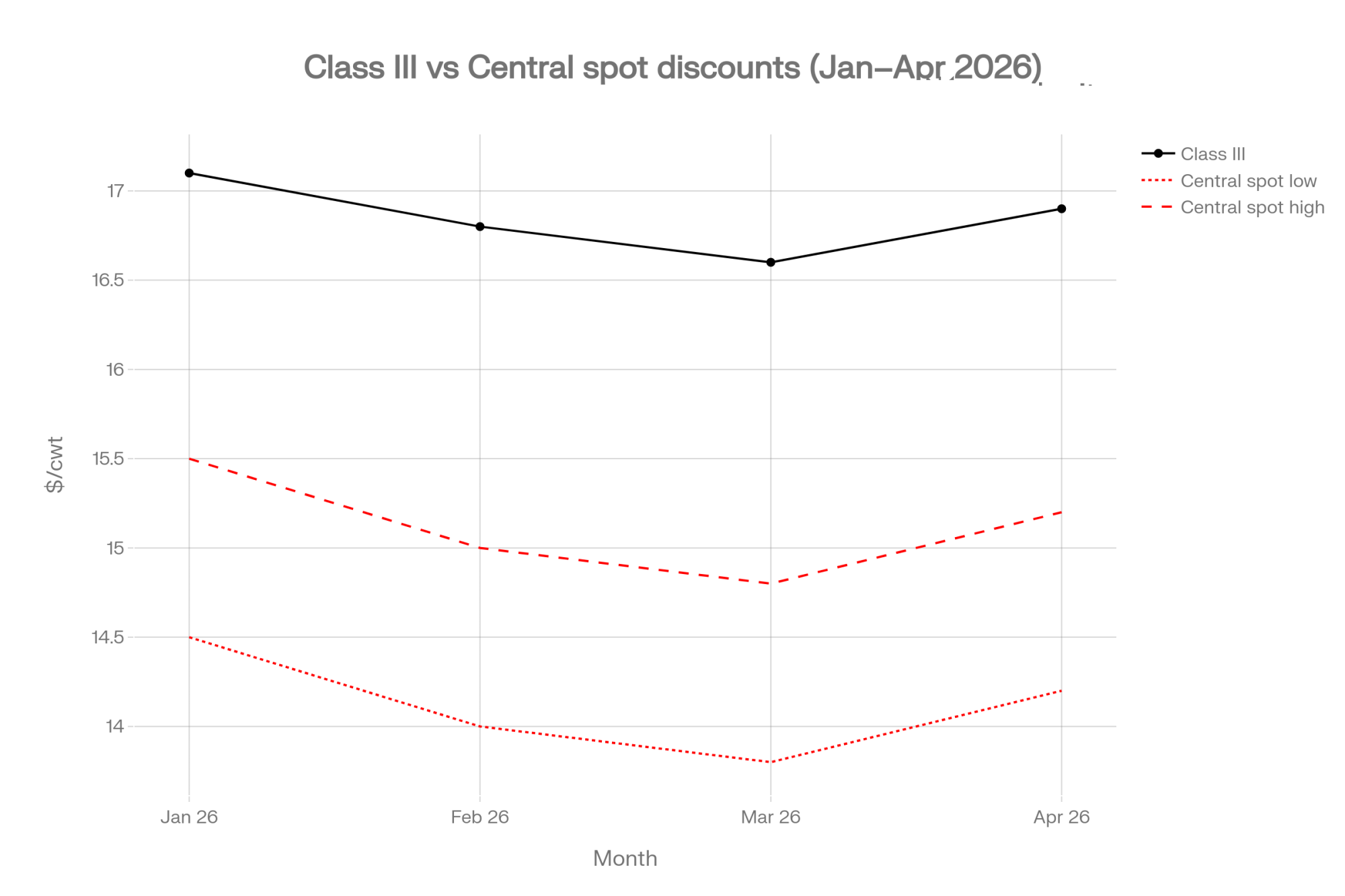 Open USDA Dairy Market News for the week of April 16, 2026, and the story changes. Central region commentary describes spot milk as readily available, with Class III spot pricing running multiple dollars under Class across recent weeks. Ever.Ag’s Milk Premiums report from the same date echoes it: Central Valley manufacturers reporting ample milk, buyers declining incoming loads because hauling distances had become uneconomic.