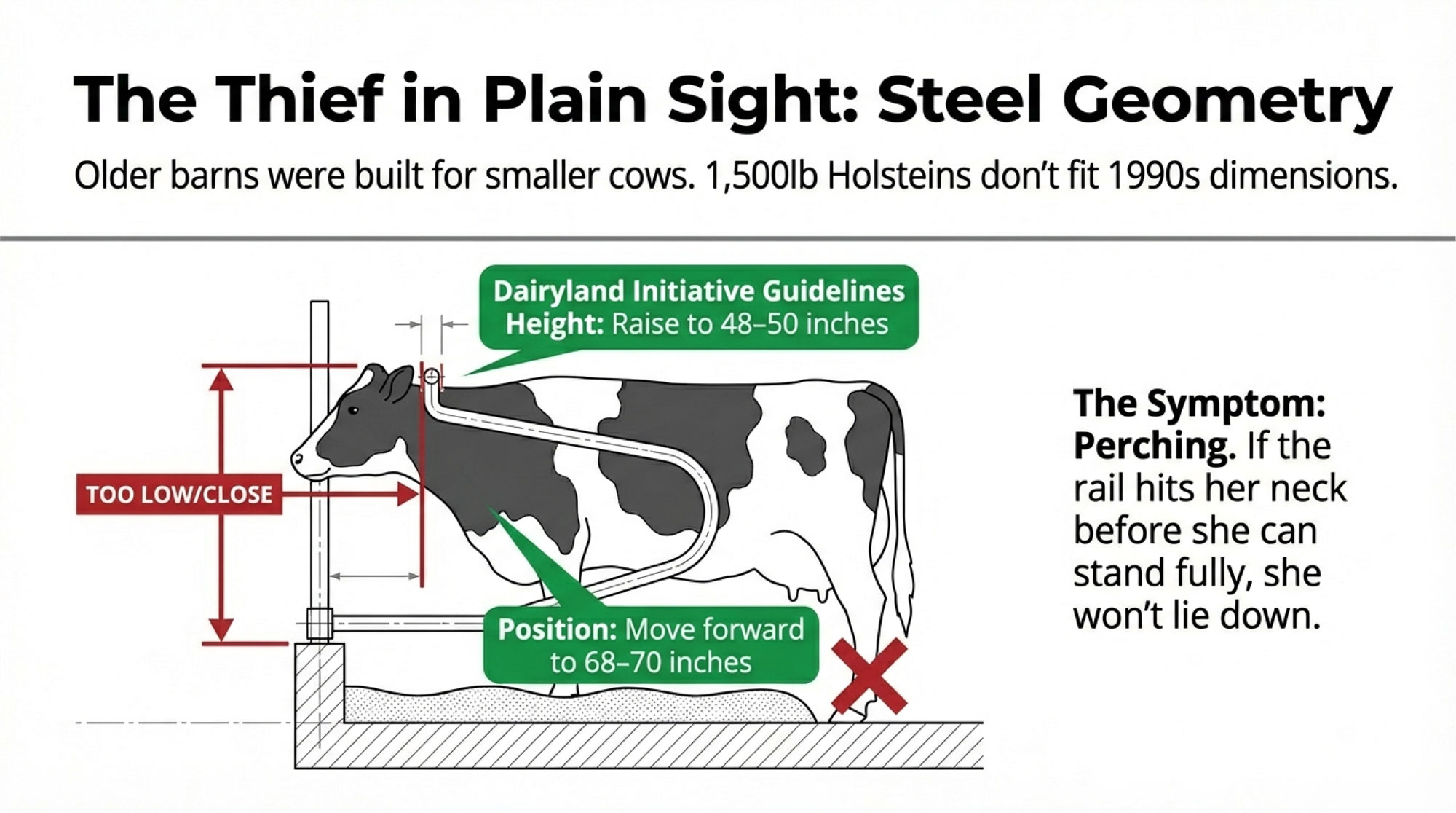 | Neck Rails Too Low/Close | Dairyland: 48–50″ high, ~68–70″ forward for big Holsteins. Low/tight rails → perching & standing in stalls (Cook/Miner) | 0.5–1.0 hr/cow/day | Measure height + forward position. Run SSI check (>20% = problem). |