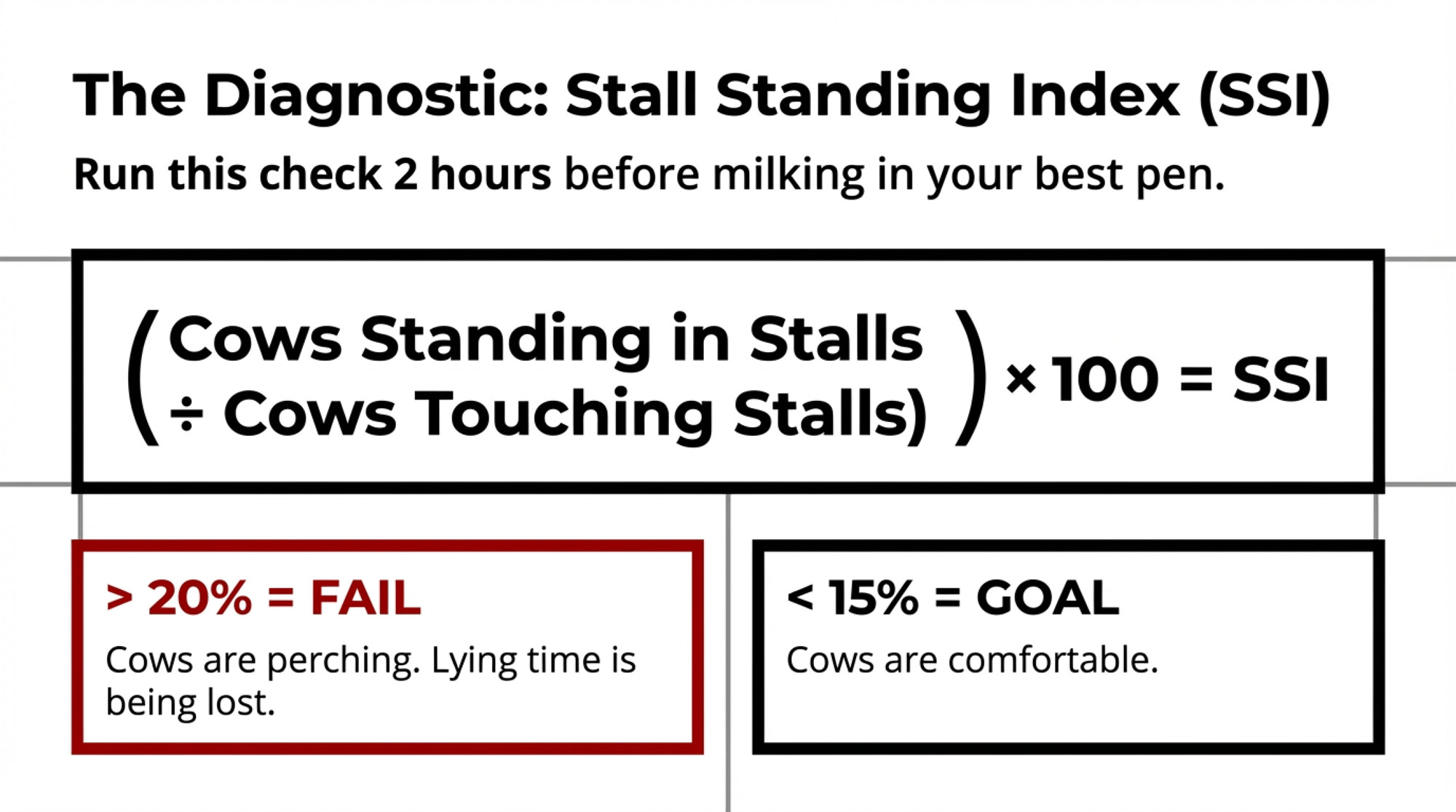 - Do the SSI walk this week. Two hours before milking, in your best pen, calculate SSI. If more than 20% of cows touching stalls are standing, Miner and Cook’s work both say lying time and hoof health are taking a hit, you’ll eventually see on the milk sheet and the cull list.