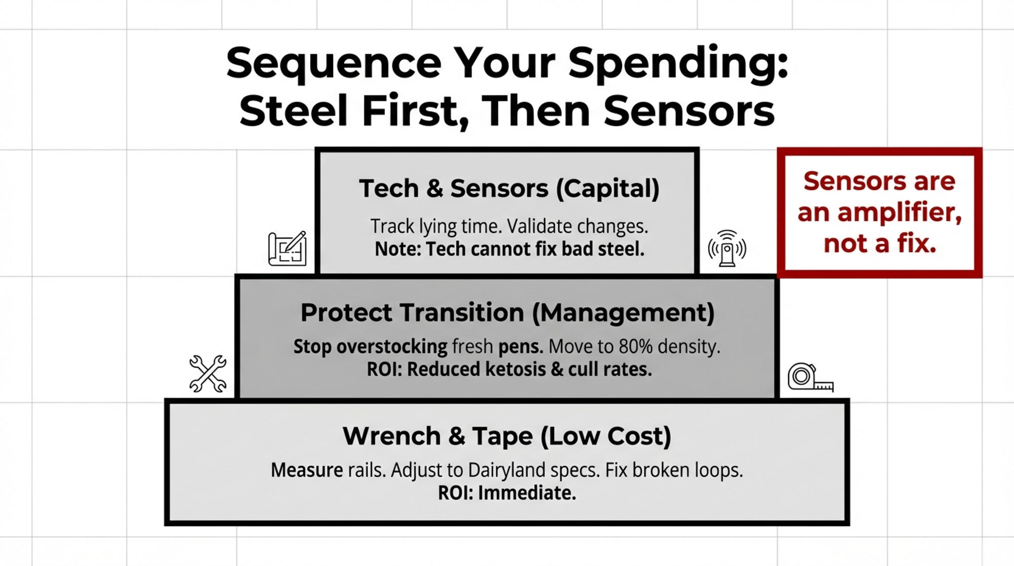 - Tech pays best as a multiplier, not a crutch. Sensors and dashboards help you manage by exception once stalls and stocking are close to right; expecting them to fix bad steel is just adding depreciation on top of lost milk.