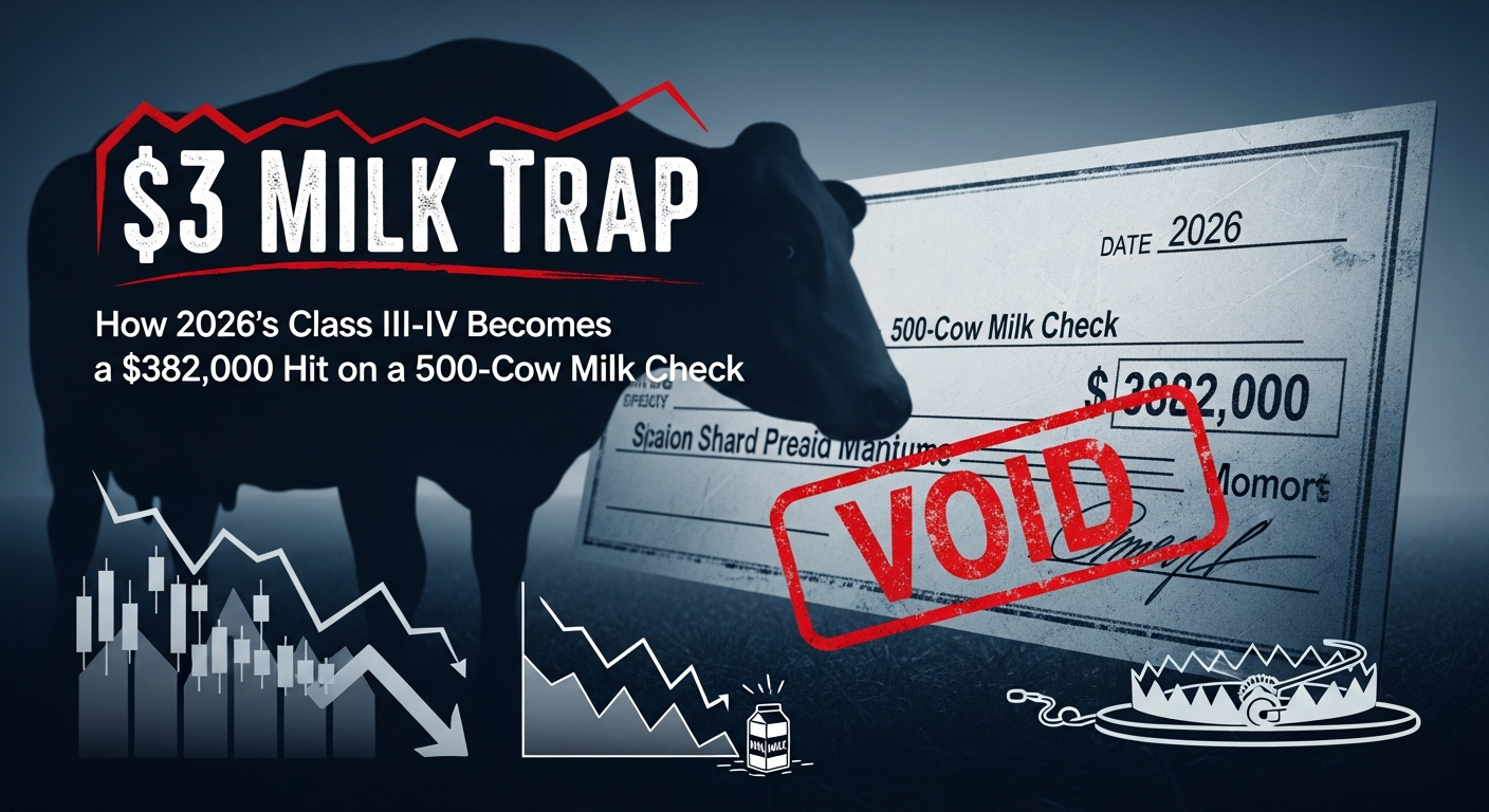 Executive Summary: January’s Class III price fell to $14.59/cwt while March Class IV futures climbed to $19.50, creating a $2.99/cwt spread that works out to about $382,000/year on a 500‑cow herd shipping 70 lbs/cow/day. That gap sits atop June 2025 make‑allowance changes that already skimmed roughly 90¢/cwt from producer checks and is being widened by a global butterfat shortage, a tight U.S. powder market, and a new $75 million USDA butter buy. At the same time, the U.S. dairy herd has grown to 9.58 million cows, the largest in more than 30 years, setting up a spring flush that could pressure prices unless Section 32 purchases and exports keep absorbing product. The one clear positive is Dairy Margin Coverage: with a projected January margin of $7.52/cwt, $9.50 coverage throws off about $1.98/cwt on Tier 1 milk, so a single month’s payment can cover several years of premiums. For a 500‑cow dairy, each combined 0.1% gain in butterfat and protein now adds roughly $46,400/year, making components one of the few levers that improve cash flow without new capital. This article doesn’t just recap those numbers; it walks through barn‑level math and a 30/90/365‑day playbook for lining up DMC enrollment, DRP weighting, component strategy, and Section 179 planning with $16–$17 Class III, not a rosy futures average. It ends with a hard question every producer has to answer: where does your breakeven sit relative to $16.51 Class III, and what are you going to do about it before the DMC window closes?