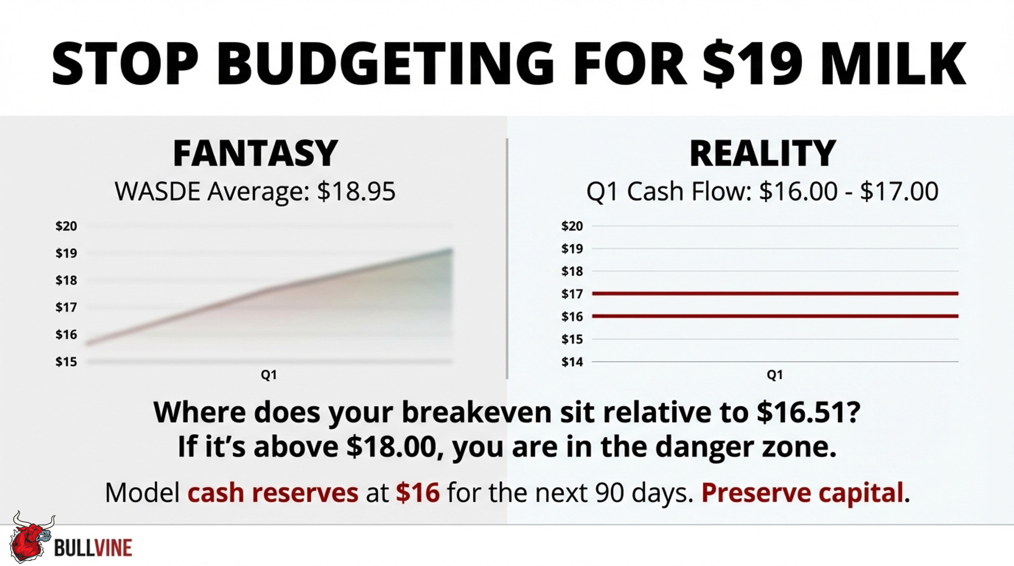 - Model cash flow at $16–$17 Class III, not the $18.95 annual WASDE average. Your March and April checks reflect January and February commodity prices, which were ugly. If your all-in cost of production sits above $18/cwt, model your cash reserve at $16 Class III for Q1 and count the months of runway.