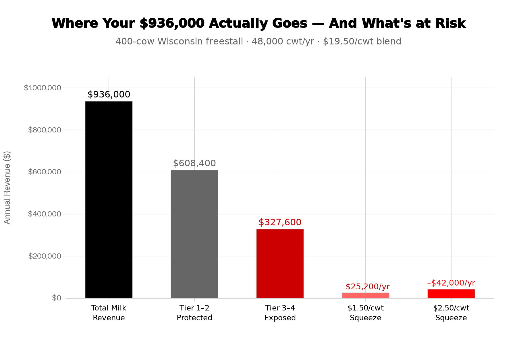 For Canadian readers: The math structure is identical. Swap in your October 2025 Ontario gross blend of roughly $42 CAD/cwt (95.46 $/hL per DFO’s October 2025 report ) and the exposed‑volume dollar amounts change, but the exposure percentage and the logic don’t. At the CAD blend, your 400‑cow total is closer to $2,016,000 CAD — and the $2.50/cwt squeeze still costs $42,000 CAD on 16,800 exposed cwt.