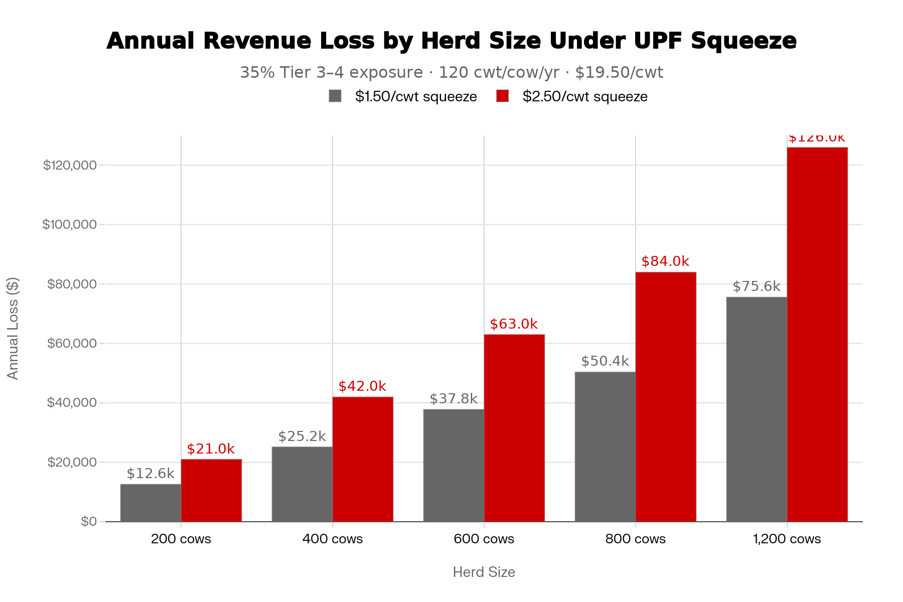 Step 4 — The squeeze scenario. If UPF pressure — school‑meal rules, warning labels, reformulation, buyer shifts — quietly shaves $1.50/cwt off the value of that exposed volume over the next several years: 16,800 × $1.50 = $25,200/year off your milk check.