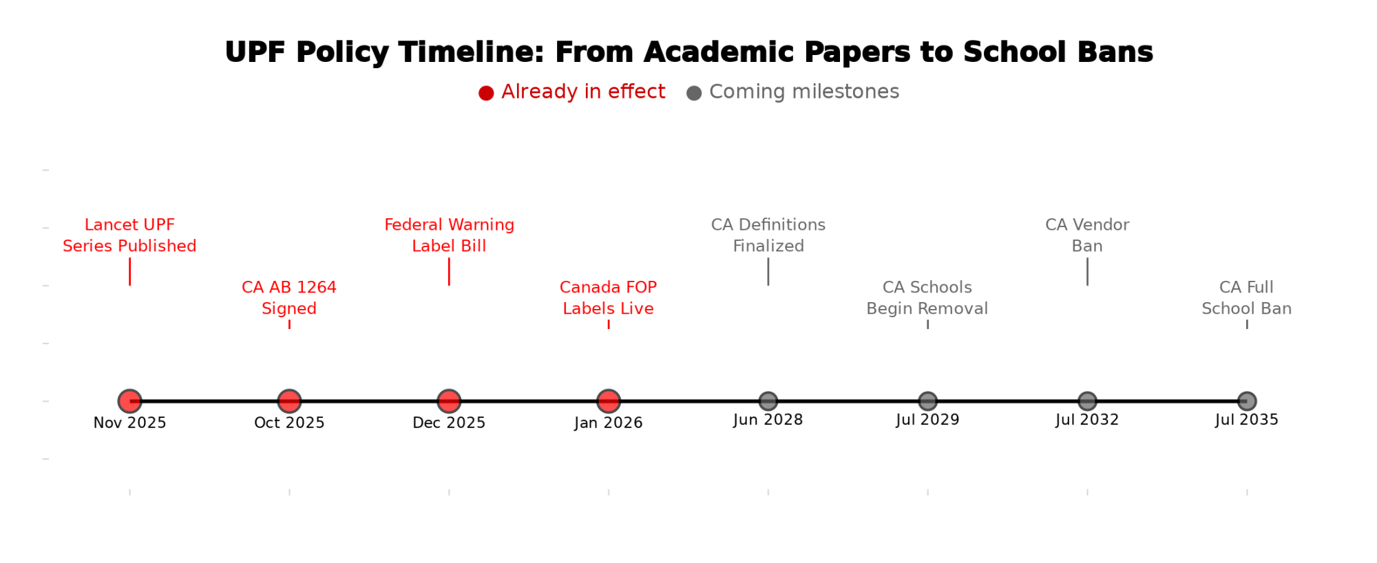 California moved first. On October 8, 2025, Governor Newsom signed AB 1264, the Real Food, Healthy Kids Act — the first law anywhere to write a statutory definition of “ultra‑processed food” and begin phasing it out of school meals. The California Department of Public Health must finalize detailed definitions of “ultraprocessed foods of concern” by June 1, 2028. From there, the timeline tightens: vendor reporting starts February 1, 2028; schools begin removing targeted products by July 1, 2029; vendors can no longer offer them to schools after July 1, 2032; and schools can no longer serve or sell them by July 1, 2035. Plain pasteurized milk is explicitly exempt. Sweetened, flavored, and additive‑heavy dairy products are not.