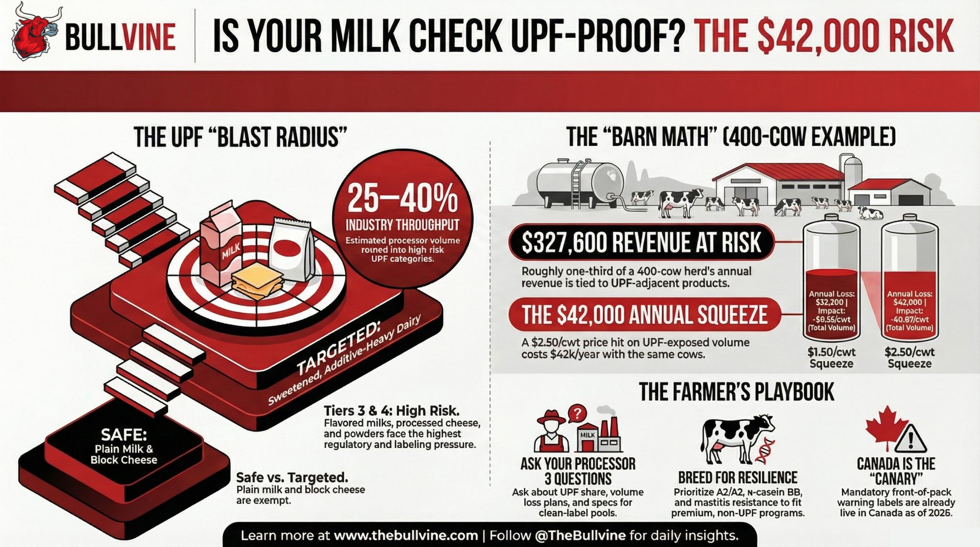 Executive Summary: Roughly a third of a 400‑cow Wisconsin herd’s annual milk revenue — about 16,800 cwt worth ~$327,600 at $19.50/cwt — is likely tied to ultra‑processed products that California has already started pushing out of schools, and Canada now tags with front‑of‑pack warning labels. This article shows how AB 1264, a federal warning‑label bill, and Health Canada’s new symbols quietly put pressure on flavoured milks, processed cheese, and dairy ingredients that many processors rely on for 25–40% of their throughput. Using a 400‑cow freestall as the example, it walks the barn math: if that exposed volume takes a $1.50–$2.50/cwt hit over the next decade, you’re looking at $25,000–$42,000/year off the milk check with the same cows and the same parlor. It contrasts how that risk lands in a deregulated U.S. FMMO system versus Ontario’s supply‑managed pool, and why geography changes your levers but not the direction of travel. You’ll get a concrete 30/90/365‑day playbook: the three questions to ask your processor now, how to map your own “UPF exposure” line item, and where breeding (A2/A2, κ‑casein BB, mastitis resistance, components) fits if you want more of your milk flowing into cheese, yogurt, and clean‑label programs instead of the policy blast radius. If you don’t know what percentage of your volume ends up in the ultra‑processed ladder — and what a $2/cwt squeeze on that slice does to your debt‑service coverage — this is the one market piece you actually can’t afford to skip.