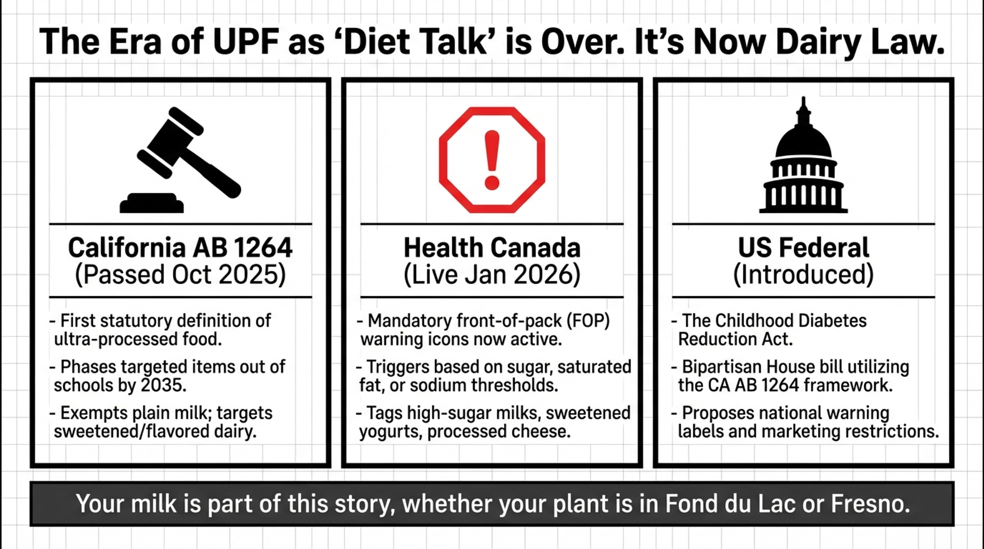 California just defined “ultra‑processed food” in statute. A federal warning‑label bill is in the House. And your processor probably can’t tell you how much of your milk ends up in the products they’re targeting.
