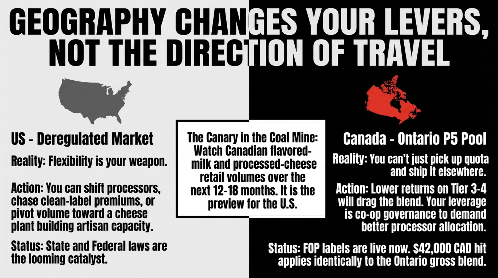 The key difference: a Wisconsin producer has more flexibility to shift processors, chase premiums, or pivot volume toward a cheese plant that’s building clean‑label capacity. An Ontario producer’s leverage comes through co‑op governance, producer meetings, and making their milk attractive enough on paper that the processor inside the system channels it toward the more resilient product lines. Different levers. Same direction.