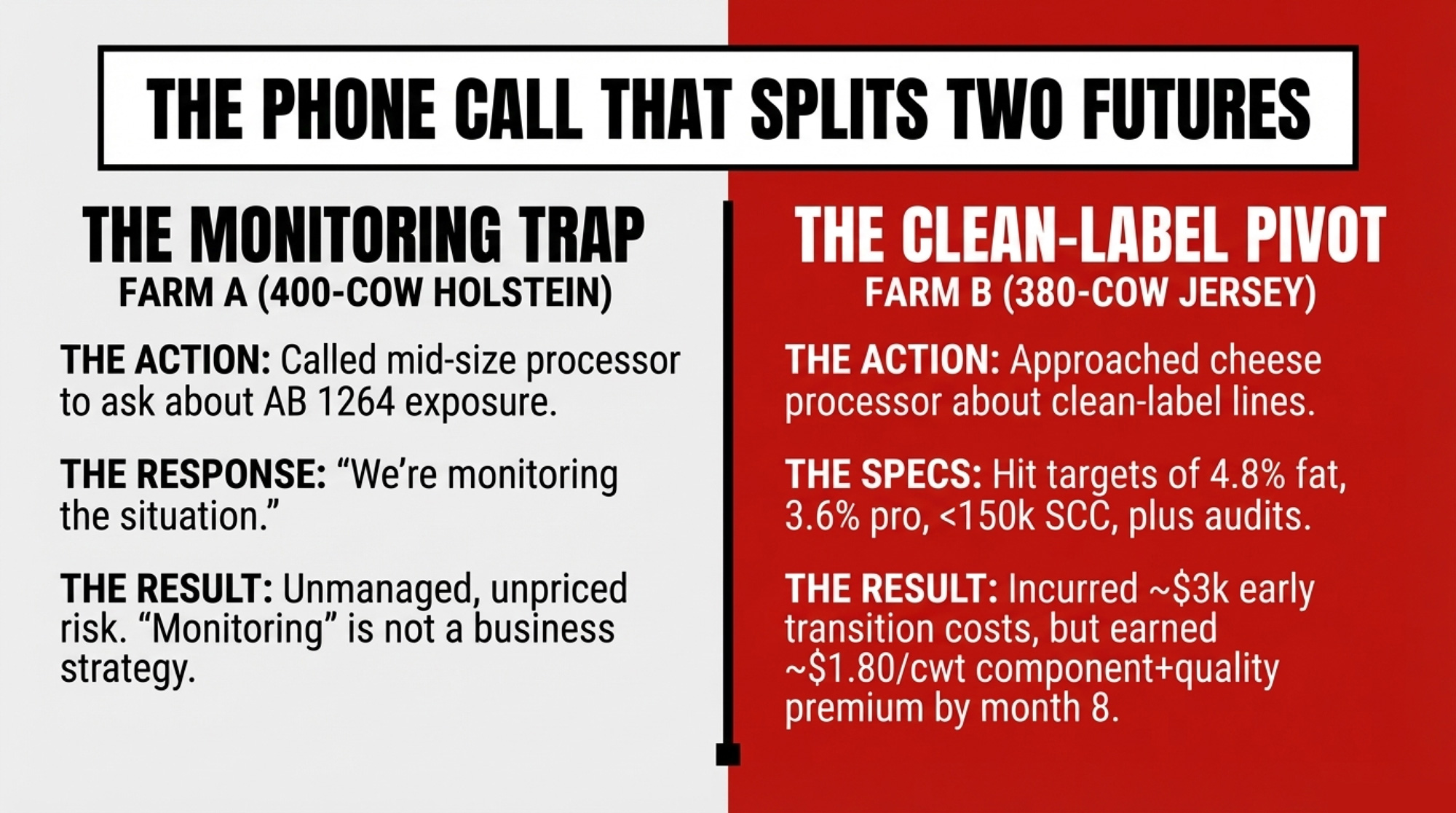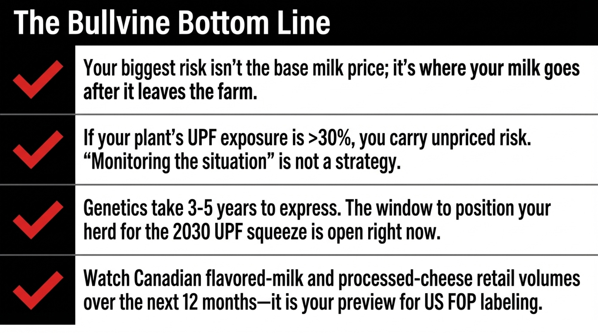 Pull your last three milk checks. Look at every deduction and utilization line. Ask yourself: how much of this revenue depends on products that California just banned from schools and Ottawa just tagged with a warning label? If the answer makes you uncomfortable, good. That discomfort is worth about $42,000 a year in planning you haven’t started yet.