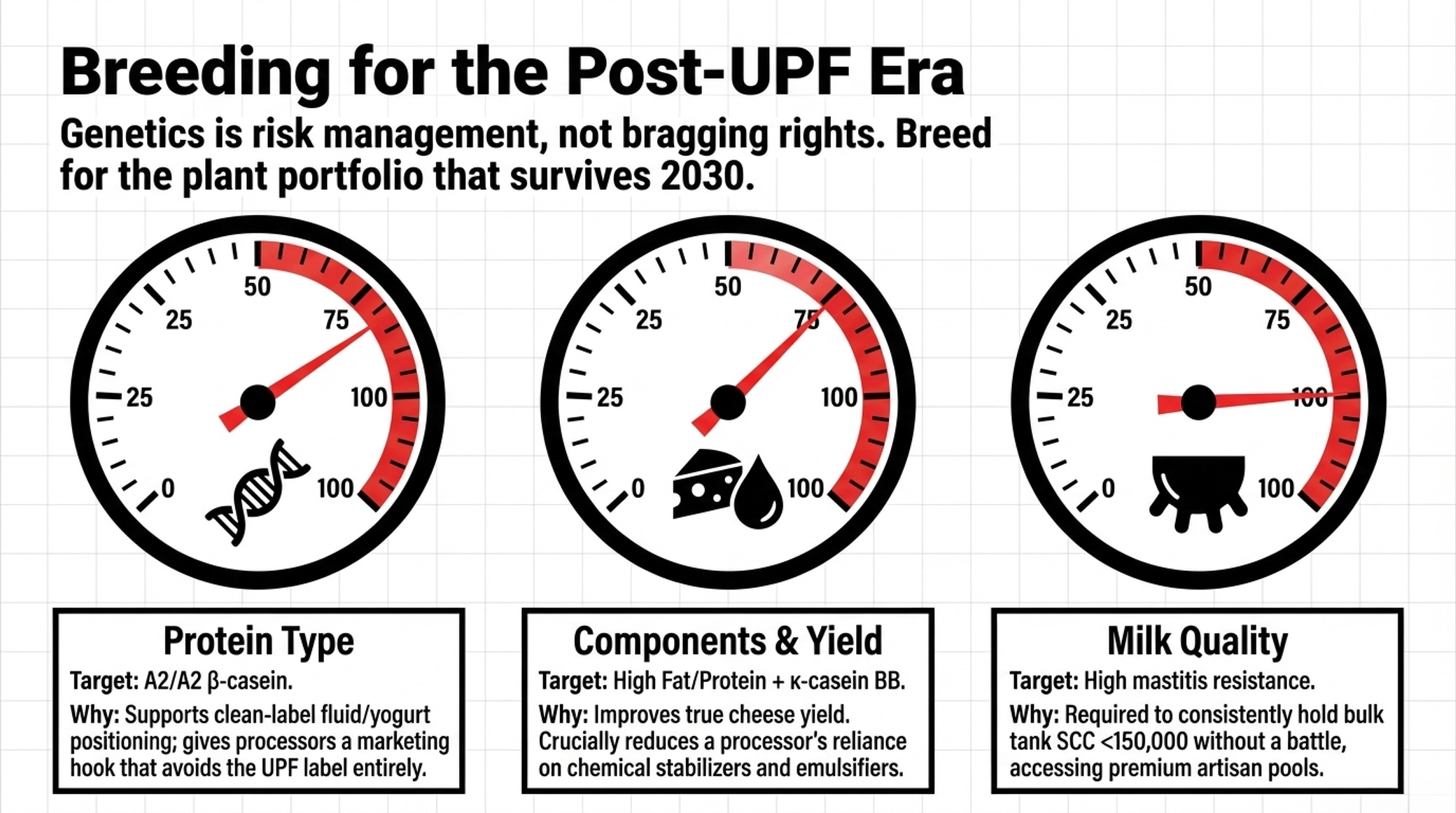 - Genetics is risk management now, not just breeding‑proof bragging. A2/A2, κ‑casein BB, mastitis resistance, and component levels aren’t premiums you chase — they’re the traits that keep your milk relevant to the product lines most likely to survive UPF pressure.