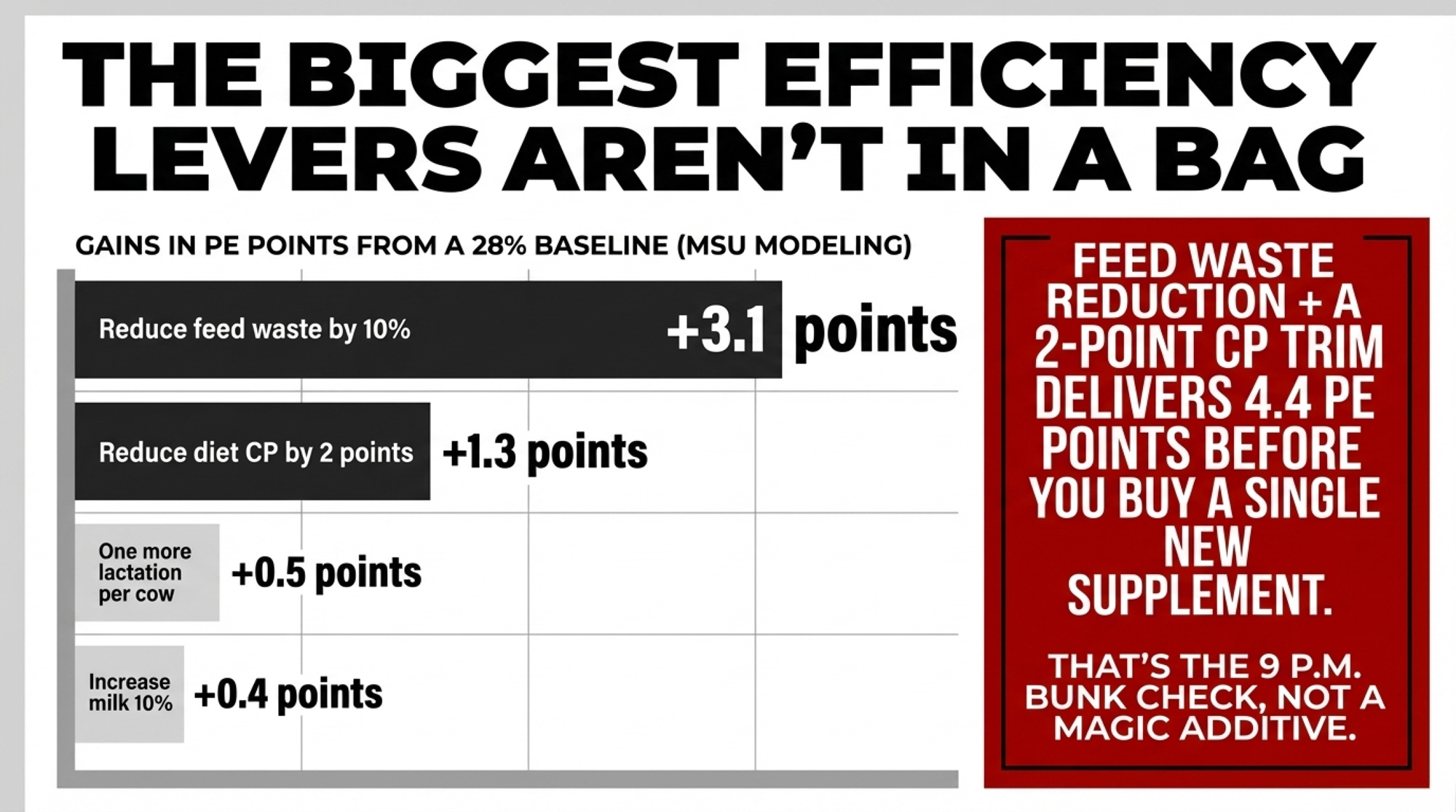 Feed waste reduction (+3.1) and a 2‑point CP trim (+1.3) together deliver more than 4.4 PE points before you buy a single new supplement.