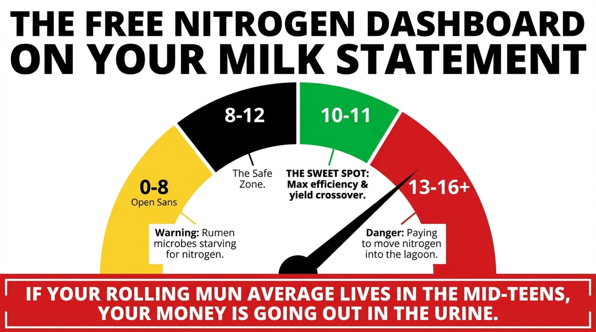 So if your rolling MUN average lives in the mid‑teens, you’re paying to move nitrogen through the cow and into the lagoon instead of into the bulk tank.