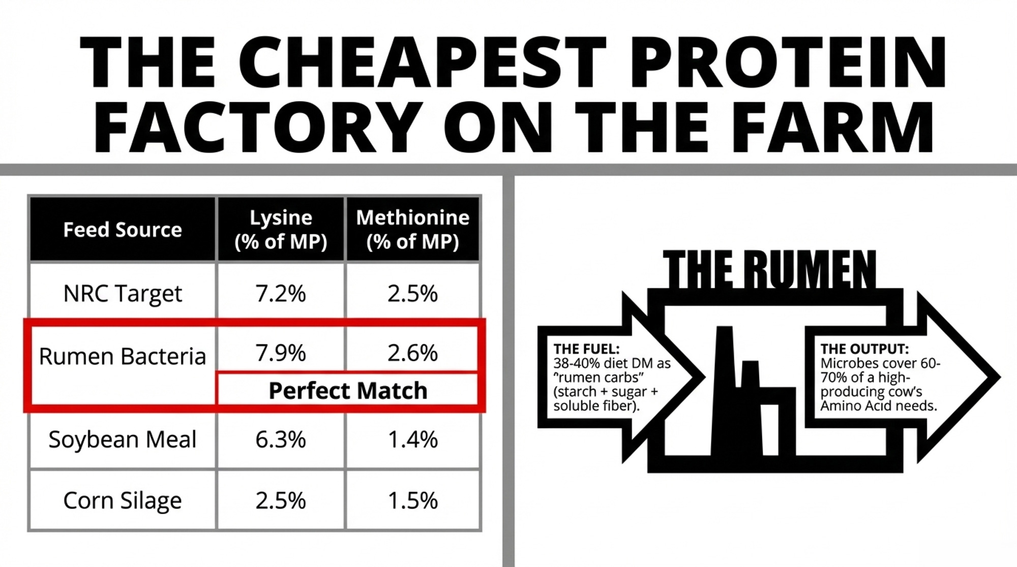 Rumen bacteria land almost exactly on the NRC target for 7.2% lysine and 2.5% methionine. When the rumen is firing, it can cover 60–70% of a high‑producing cow’s amino acid needs.