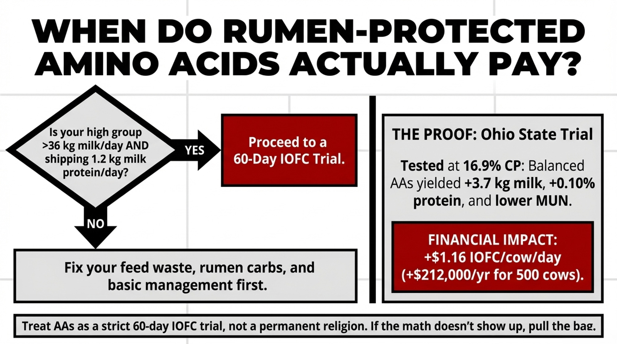 Use a modelling tool to balance lysine and methionine. Pick a rumen‑protected methionine product with published data. Track IOFC, not just milk volume. Set a kill date if the economics don’t show up.