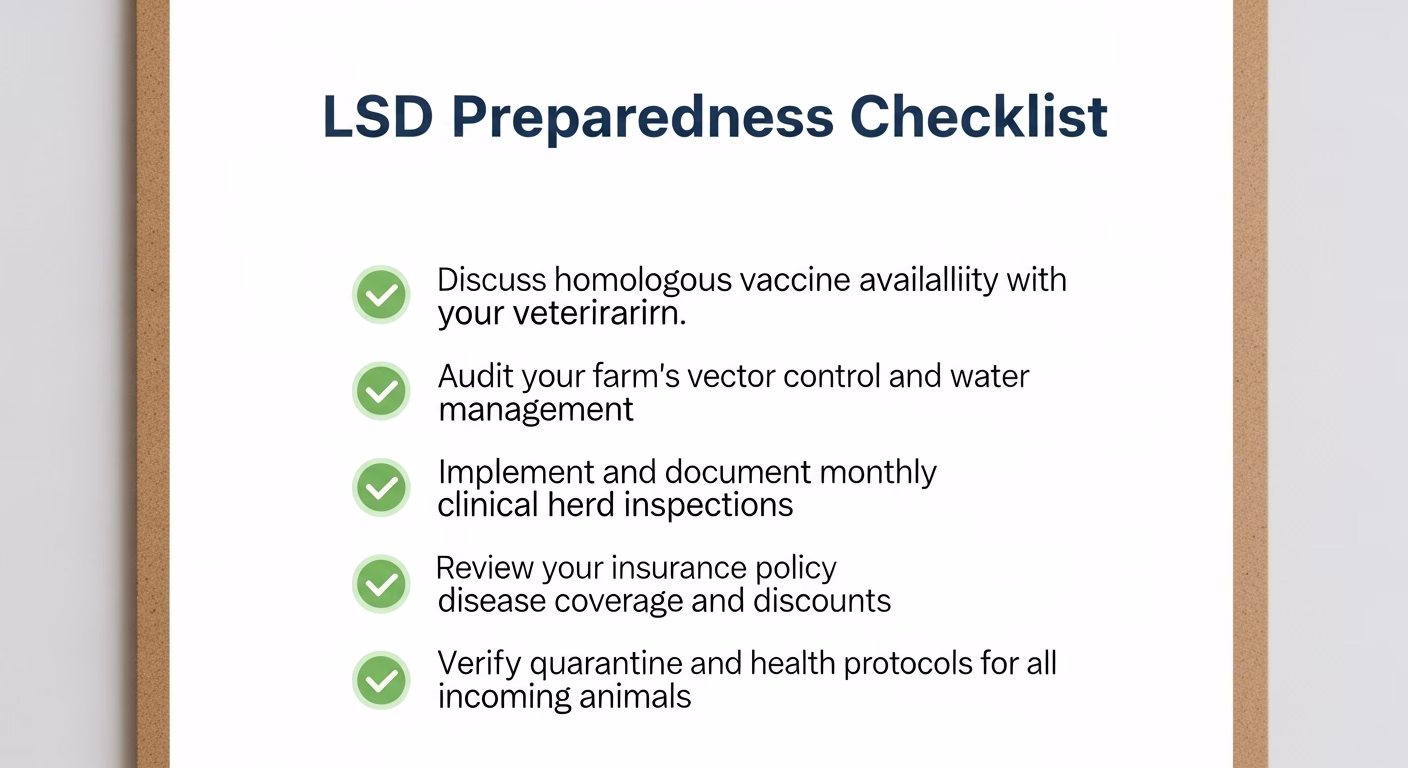 - Monthly clinical inspections are your new normal — Train your crew to spot skin lesions and nodules during high-risk periods (April-October) because early detection is the difference between managing a case and losing your herd. Document everything for insurance and trade certification purposes.