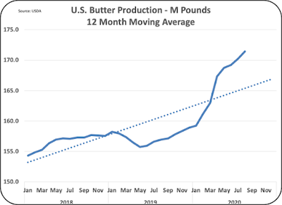 Production of Butter is shown in Chart VII. This is shown as a 12-month moving average as there are annual cycles of butter production that make trends more difficult to follow. Butter production has been increasing in 2019 and 2020, after years of minimal changes in butter churning. In 2020, the increases have been very significant, and with little impact from COVID-19.