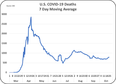 The first item to be reviewed will be the deaths in the U.S. that are related to COVID-19. Chart I below shows a 7 day rolling average of COVID-19 deaths starting in March 2020 through the most current available data. As reported by the CDC, the majority of these deaths result from underlying health conditions complicated by COVID-19. The largest spike was in April with another increase in August. Since the beginning of August to the present there is a downward trend in deaths.