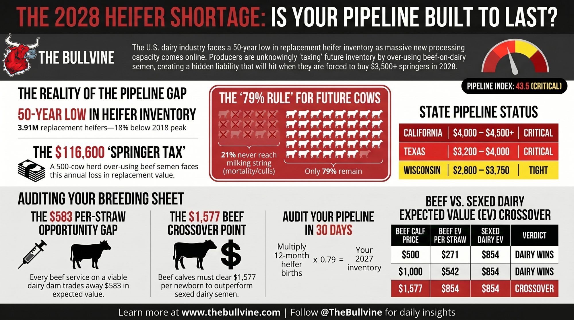 Pipeline and economic data: NAAB 2025 Year-End Report (March 2026), USDA Cattle Inventory (January 2026 release), USDA Agricultural Prices (July 2025), USDA Class and Component Prices (January–March 2026), CoBank Knowledge Exchange (August 2025) as a secondary reference, and ISU Extension NW Iowa Dairy Outlook (May and December 2025). State herd shares derived from USDA NASS Milk Cows: State (2025). Biological conversion rates reference Dr. Michael Overton’s Zoetis field dataset of 85 commercial Holstein herds. The 600,000–611,600 retained-cow estimate is The Bullvine’s extrapolation from ISU’s documented weekly deficit data, not a USDA statistic. EV figures rounded from precise derivation: $853.90 sexed and $270.75 beef at a $500 calf. The ~$3.15/lb feeder-equivalent is derived from dividing the $1,577 crossover by a 500-lb weaned weight, not from a published market series; it is illustrative only. State-level HPAI and Texas herd-concentration figures reflect Bullvine reporting aggregated from USDA APHIS and state extension sources. National averages may not reflect your specific region, herd size, or management system. All figures USD.