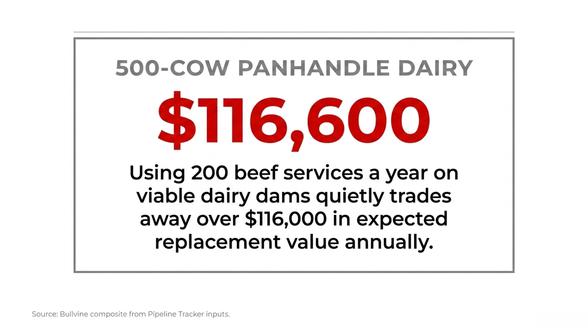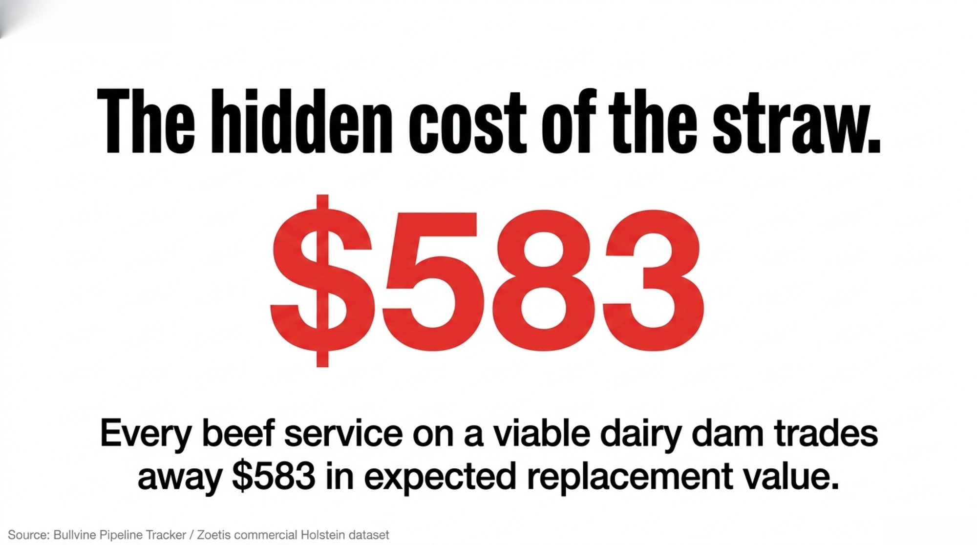 - The per-straw math isn’t close: Every beef service on a viable dairy dam trades away ~$583 in expected replacement value. On a 500-cow Panhandle herd running 35% beef-on-dairy, that’s ~$116,600 a year walking off the breeding sheet.