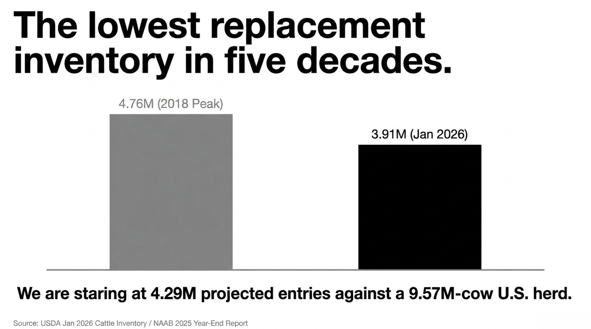 - The gap is real: 4.29M projected milking-herd entries for 2027 against a 9.57M-cow U.S. herd, with USDA’s most recent Cattle Inventory at 3.91M replacement heifers — the lowest in nearly five decades.