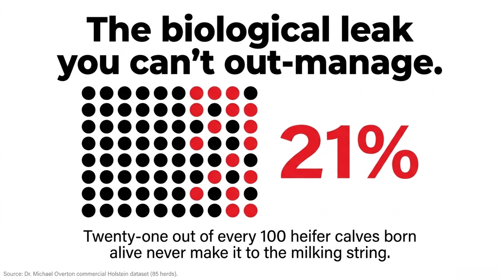 Twenty-one out of every 100 heifer calves born alive never make it to the milking string. That’s a fifth of the rearing investment walking out the door, baked into every pipeline projection that matters.