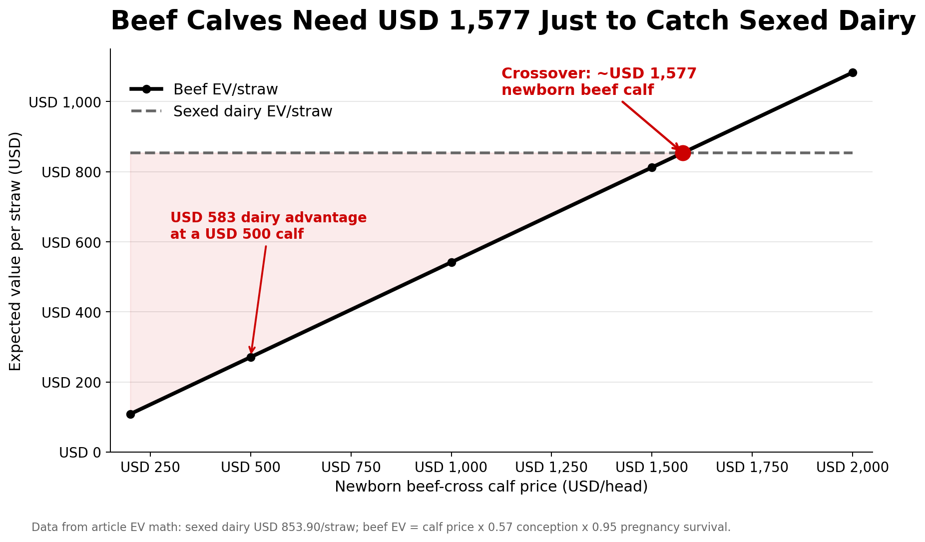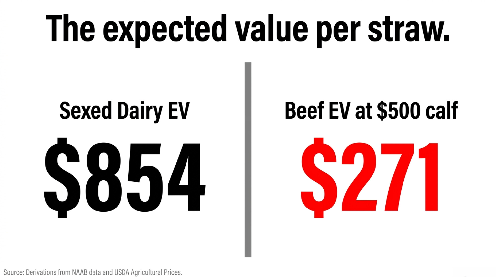 - Beef EV per straw at a $500 calf: $500 × 0.57 × 0.95 ≈ $271.