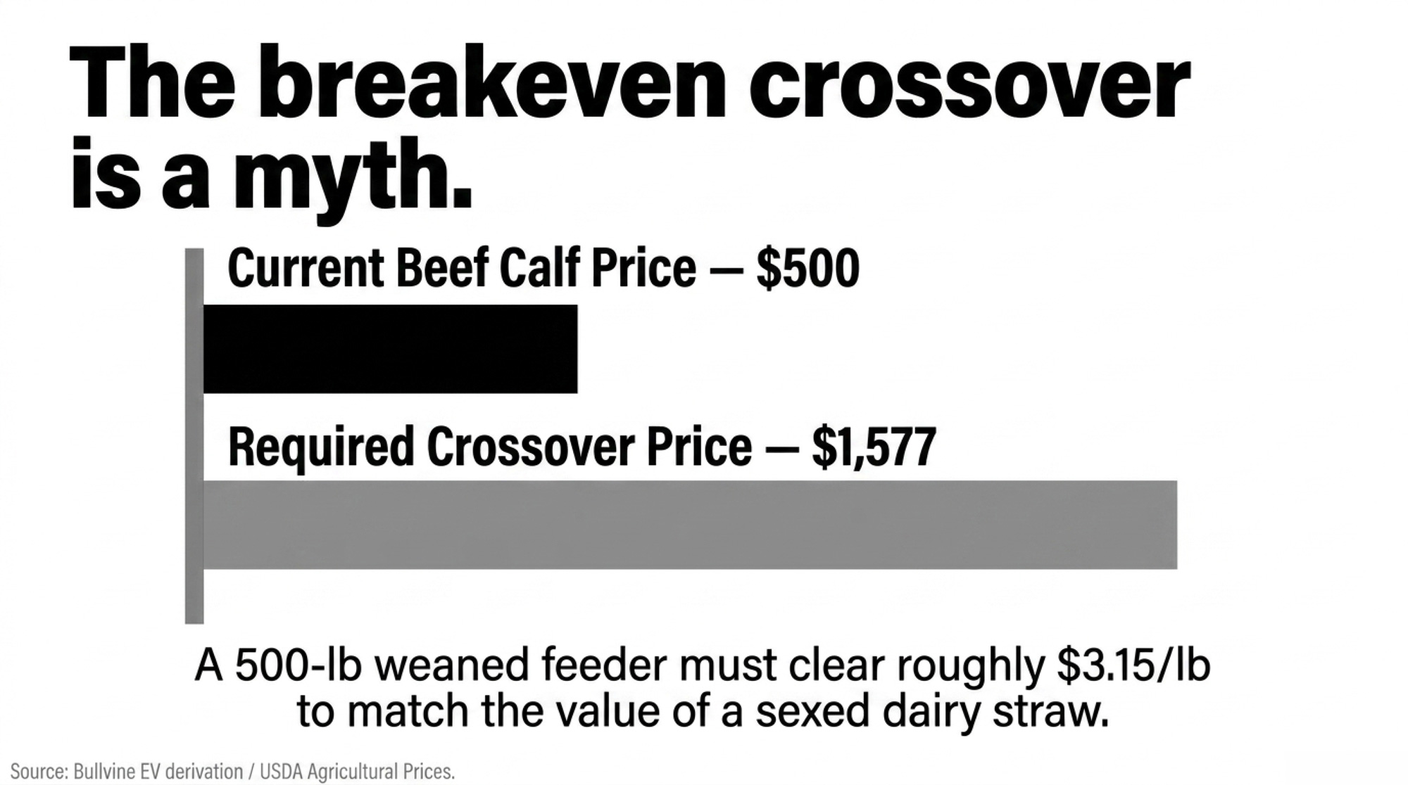 Beef calves have to clear roughly $1,577 per newborn to match sexed dairy at a $3,010 heifer. To put that in barn terms: a 500-lb weaned feeder would need to clear roughly $3.15/lb to land there — a number that assumes a high-demand year and ignores the feed and yardage cost of carrying the calf from newborn to that weight. Current beef-cross calf prices from dairy herds run $200 to $500-plus depending on genetics and region. Weaned feeders in program and video sales push higher, but at the breeding-decision level — the straw going in the gun — the math isn’t close.