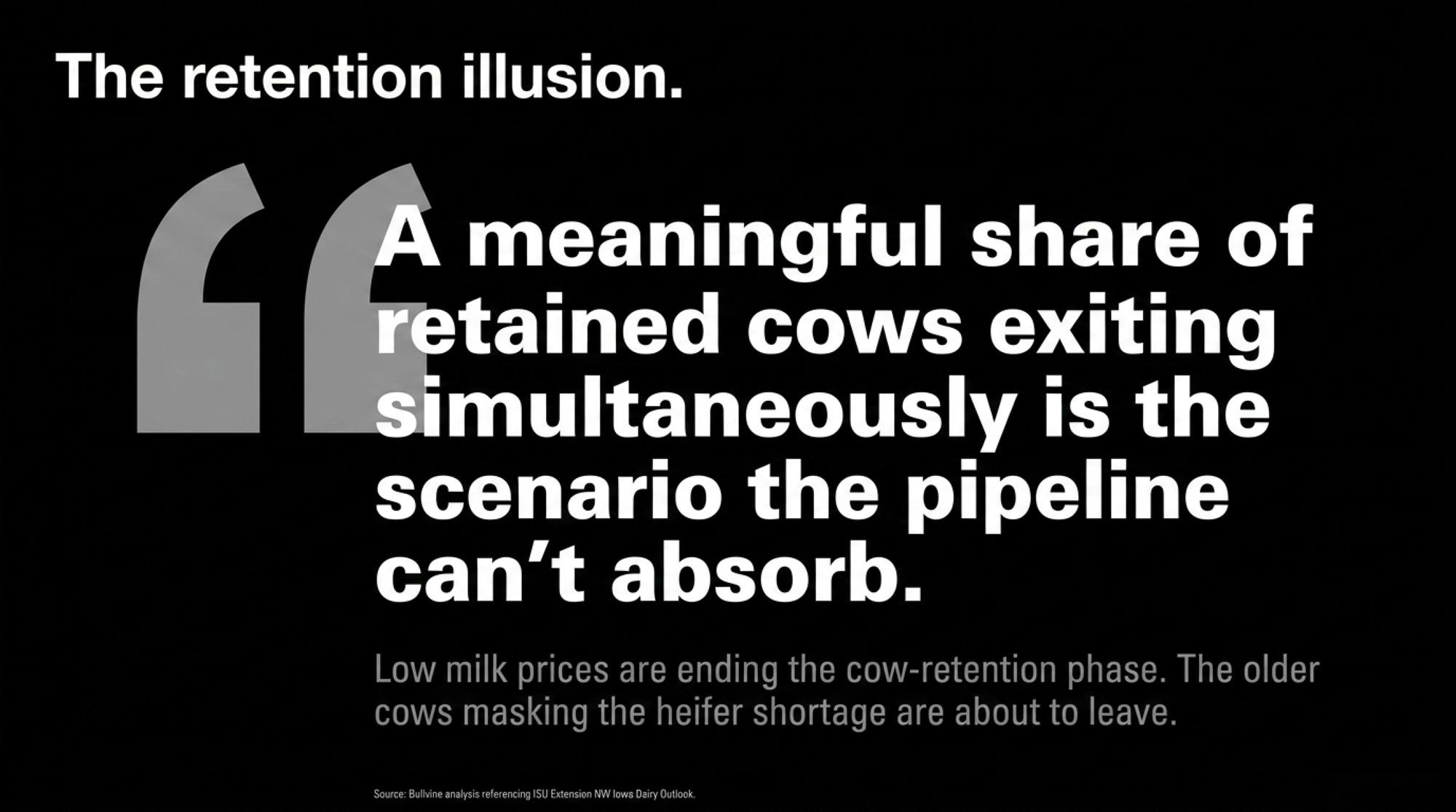 A meaningful share of those retained cows exiting simultaneously is the scenario the pipeline can’t absorb. The cows being held to supply $11 billion in new processing capacity are, by definition, the least productive animals in the herd.