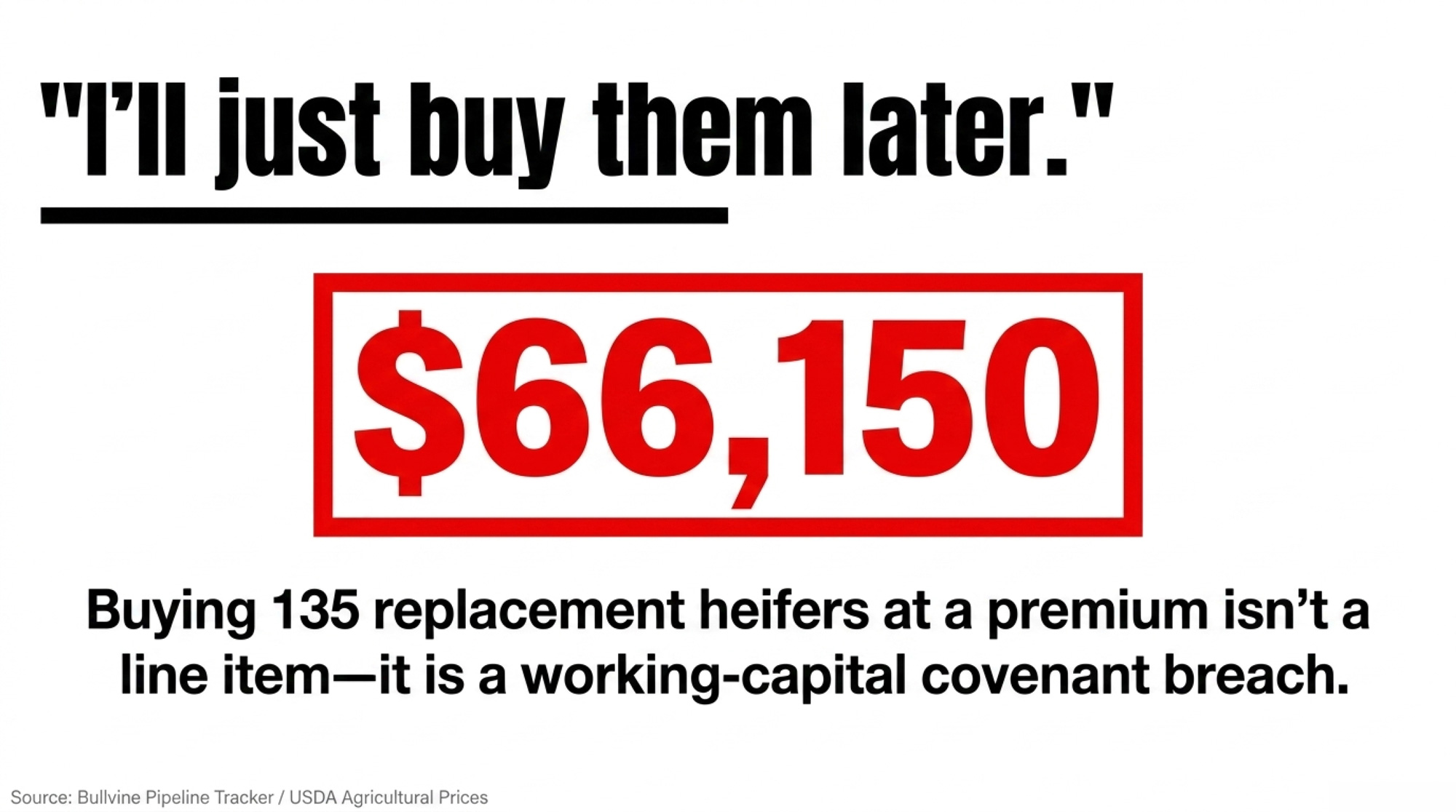 Before your next lender review, know two numbers cold: your current working-capital-to-revenue ratio and the specific covenant thresholds in your operating note. If a $66,000-plus unplanned heifer draw trips a covenant or forces a term-out, “I’ll buy later” stops being a strategy and starts being a restructuring conversation.