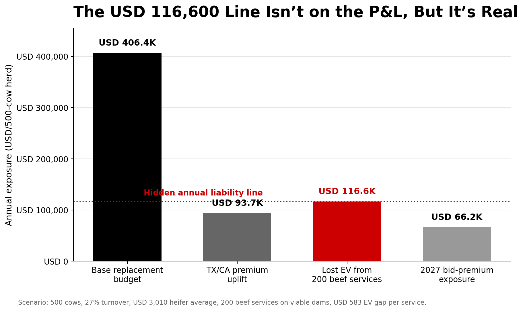 | 2027 bid-premium exposure, 135-heifer purchase at $3,500 vs. $3,010 ($490 premium) | ~$66,150 | Future risk (single-year) |
