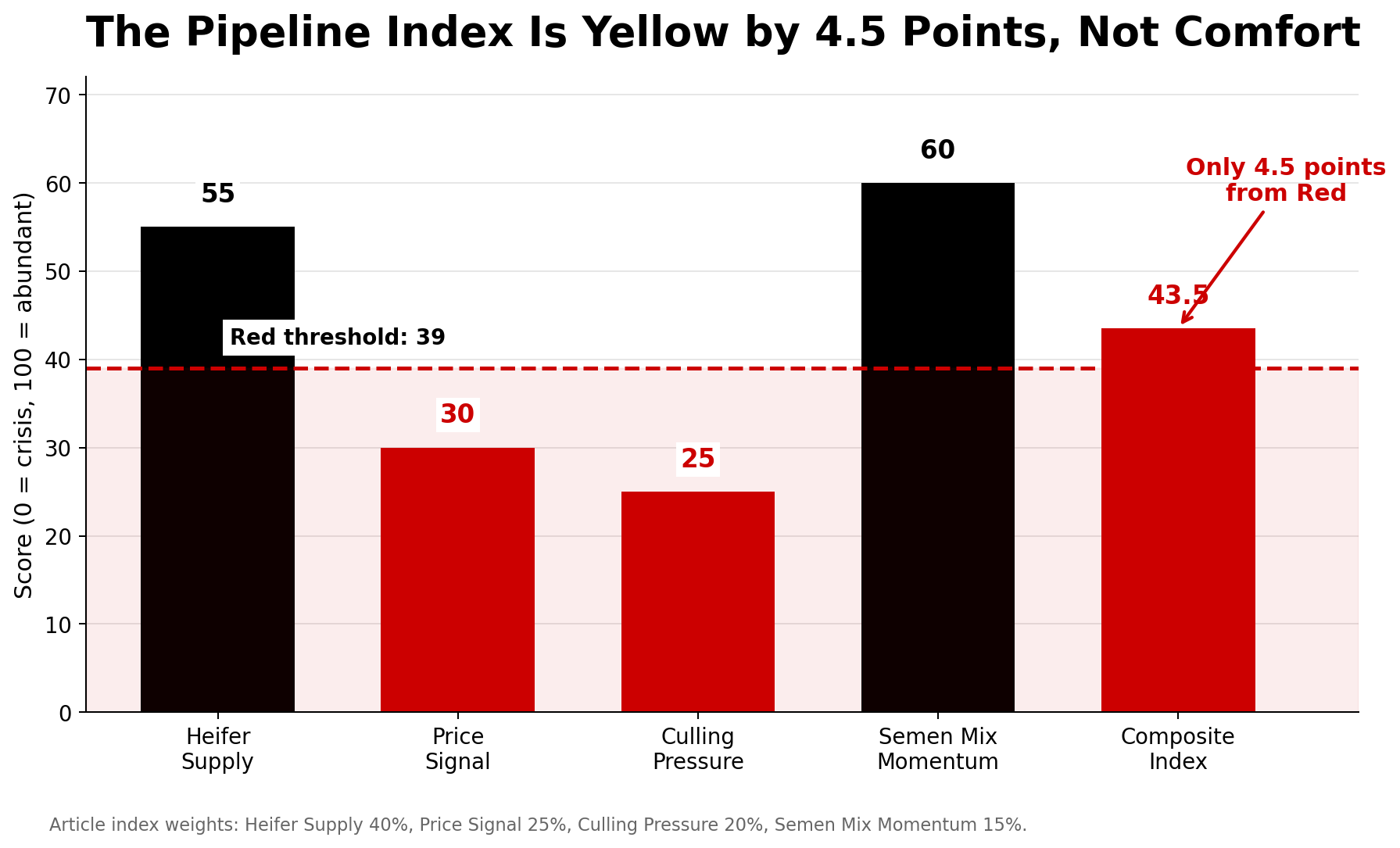 - The Pipeline Index sits at 43.5 — Yellow Zone, 4.5 points from Red. Semen mix momentum is the only component holding the score up, and it takes 24 months to turn a straw into a milking cow. One rough culling quarter pushes the national pipeline into critical territory.