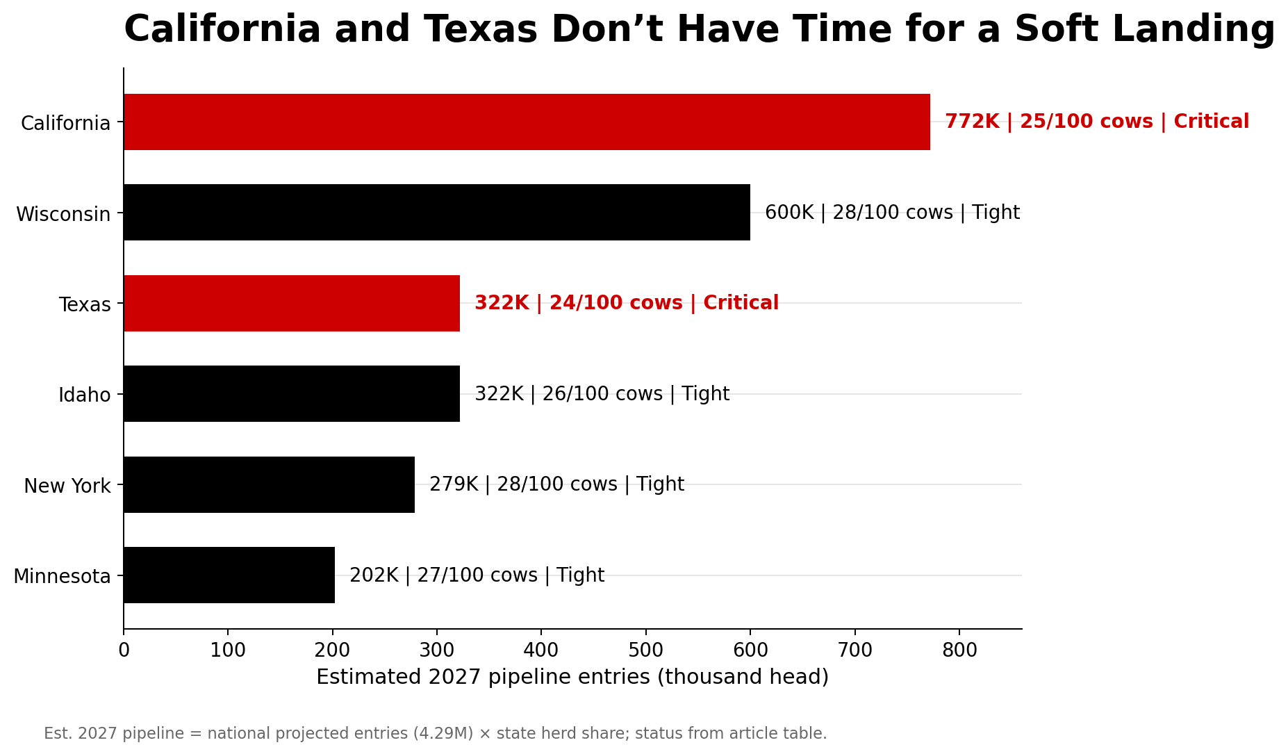 *Est. 2027 pipeline reflects each state’s projected share of national milking-herd entries (4.29M × state herd share), not in-state replacement-heifer inventory. State herd shares derived from USDA NASS Milk Cows: State (2025).