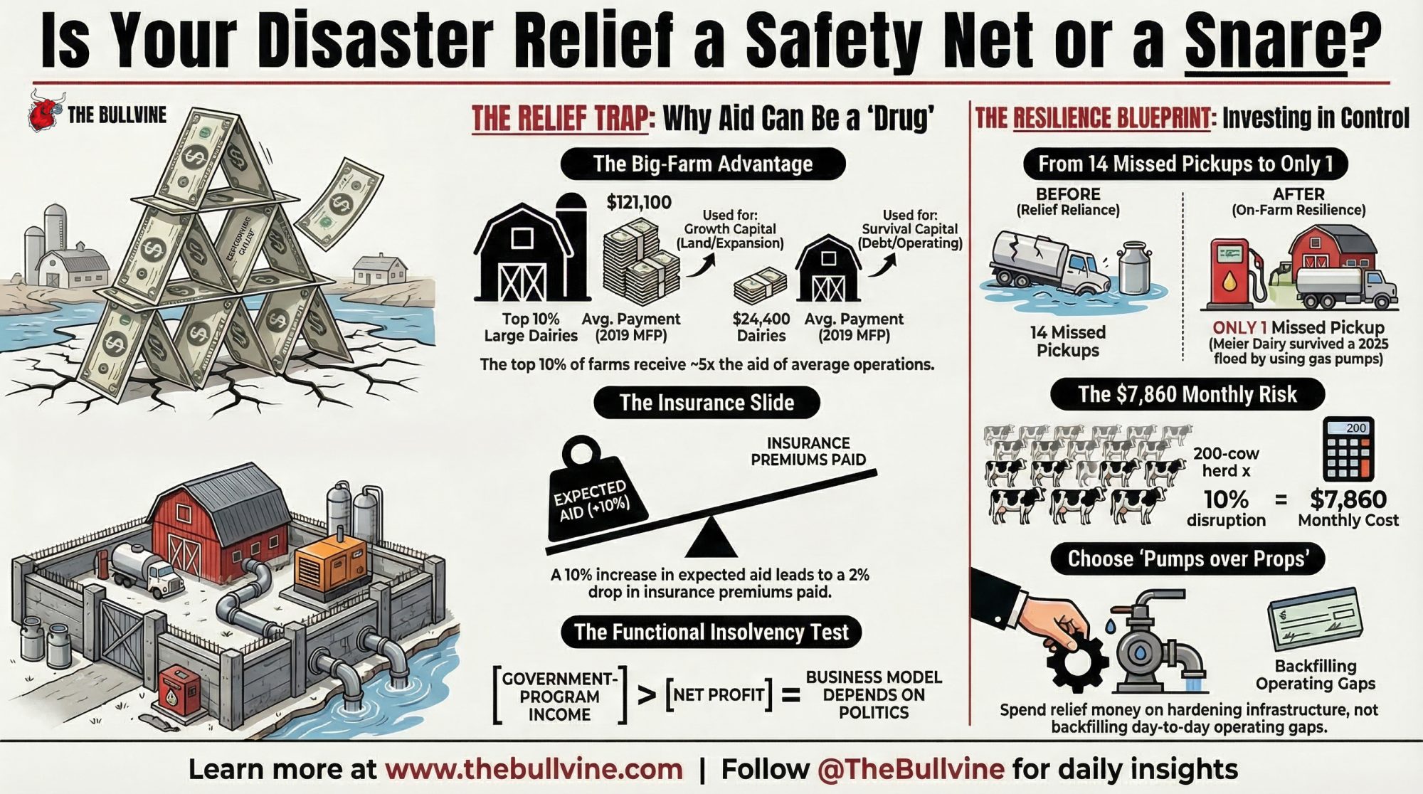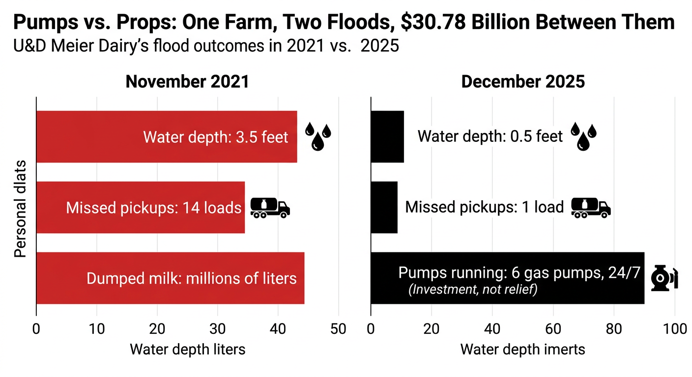 Executive Summary: Three floods on Sumas Prairie turned U&D Meier Dairy into the test case for what happens when you stop betting your future on disaster relief. This article tracks how the Meiers went from 3.5 feet of water and 14 dumped loads in 2021 to just one missed pickup in 2025 by spending on pumps, drainage, and backup power instead of waiting for the next cheque. It explains how the $30.78 billion American Relief Act of 2025 and USDA’s $16.1 billion SDRP, combined with Deryugina and Kirwan’s moral‑hazard research, quietly push farms toward thinner insurance coverage and concentrate “growth capital” in the largest 5–10% of operations. A simple barn‑math run on a 200‑cow herd at 67 lb/day and a $19.55/cwt mailbox price turns a 10% disruption into a real‑dollar hit you can plug your own numbers into. Then it forces the uncomfortable test: if your government‑program income is higher than your net profit, you’re not really profitable — you’re dependent. You get four concrete ways to use relief money — pumps vs props, buffer vs expansion, catastrophe‑only vs operating patch — plus a 30‑day zero‑relief stress test to sit down and run with your lender.