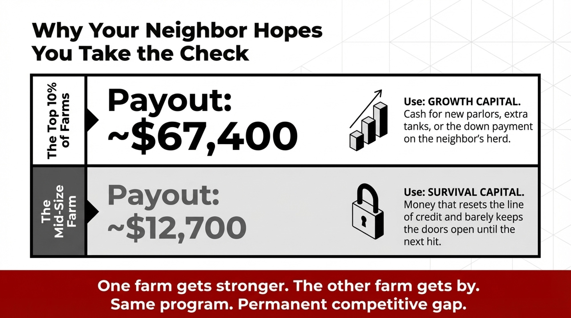 That gap compounds every cycle. After two or three rounds of ad hoc relief, the big operation has used the cushion to add cows, lock in processing contracts, and push down unit costs. The smaller operation has used the same cheques to survive — and is right back where it started, only older and a little more leveraged. When the next disaster comes, the big operation can self‑insure. The smaller one is back at the mailbox, waiting.