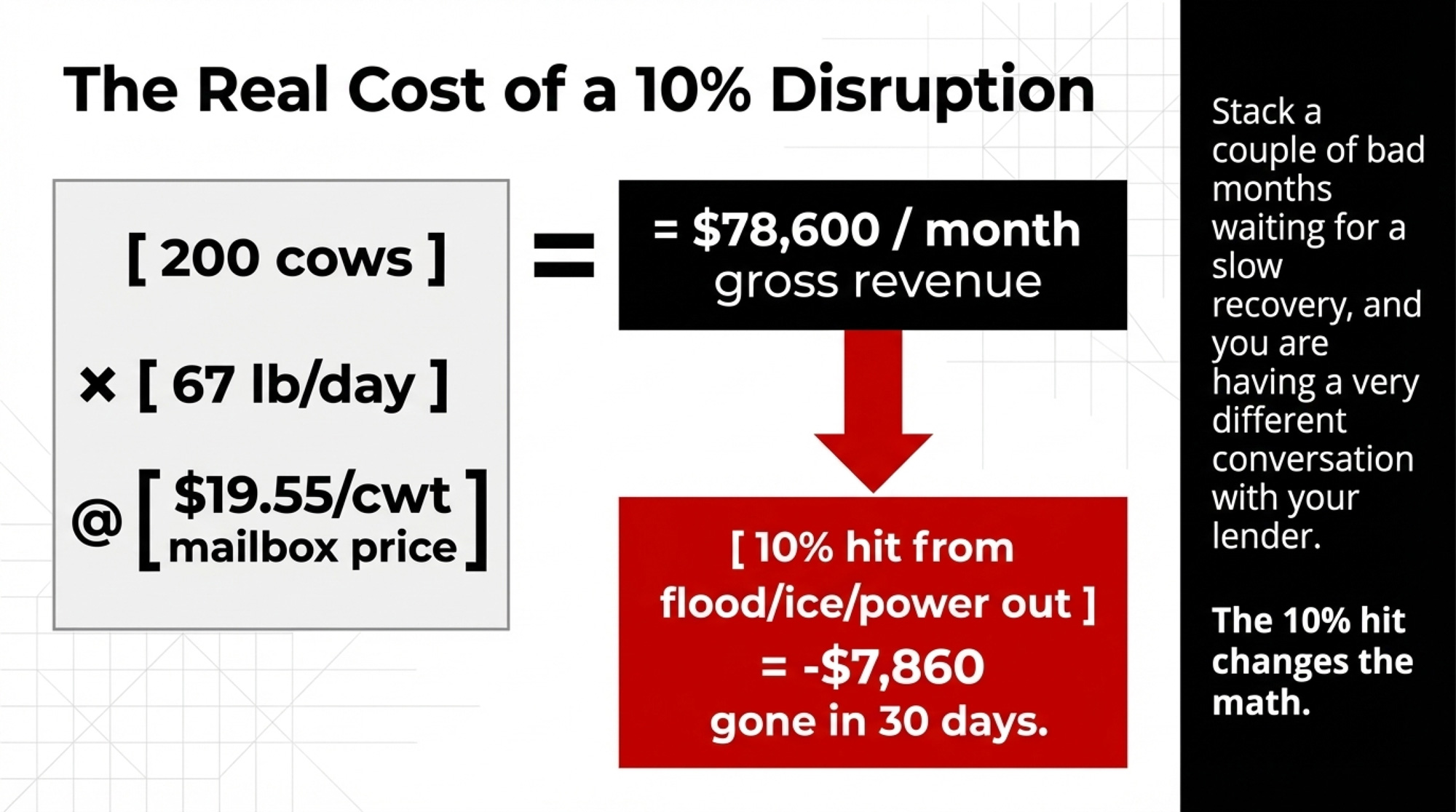 Now suppose a disruption — a flood, an ice storm, a prolonged power outage — takes out 10% of your shipments for a month before you can get everything running again. That’s about $7,860 in gross revenue gone for those 30 days. Not the whole cheque. Not catastrophic by itself. But stack a couple of bad months or a slower recovery, and you’re looking at the kind of hole that changes your next lender conversation. Across Sumas Prairie in 2021, that same principle multiplied across every dairy on the flat as loads were dumped and pickups missed.
