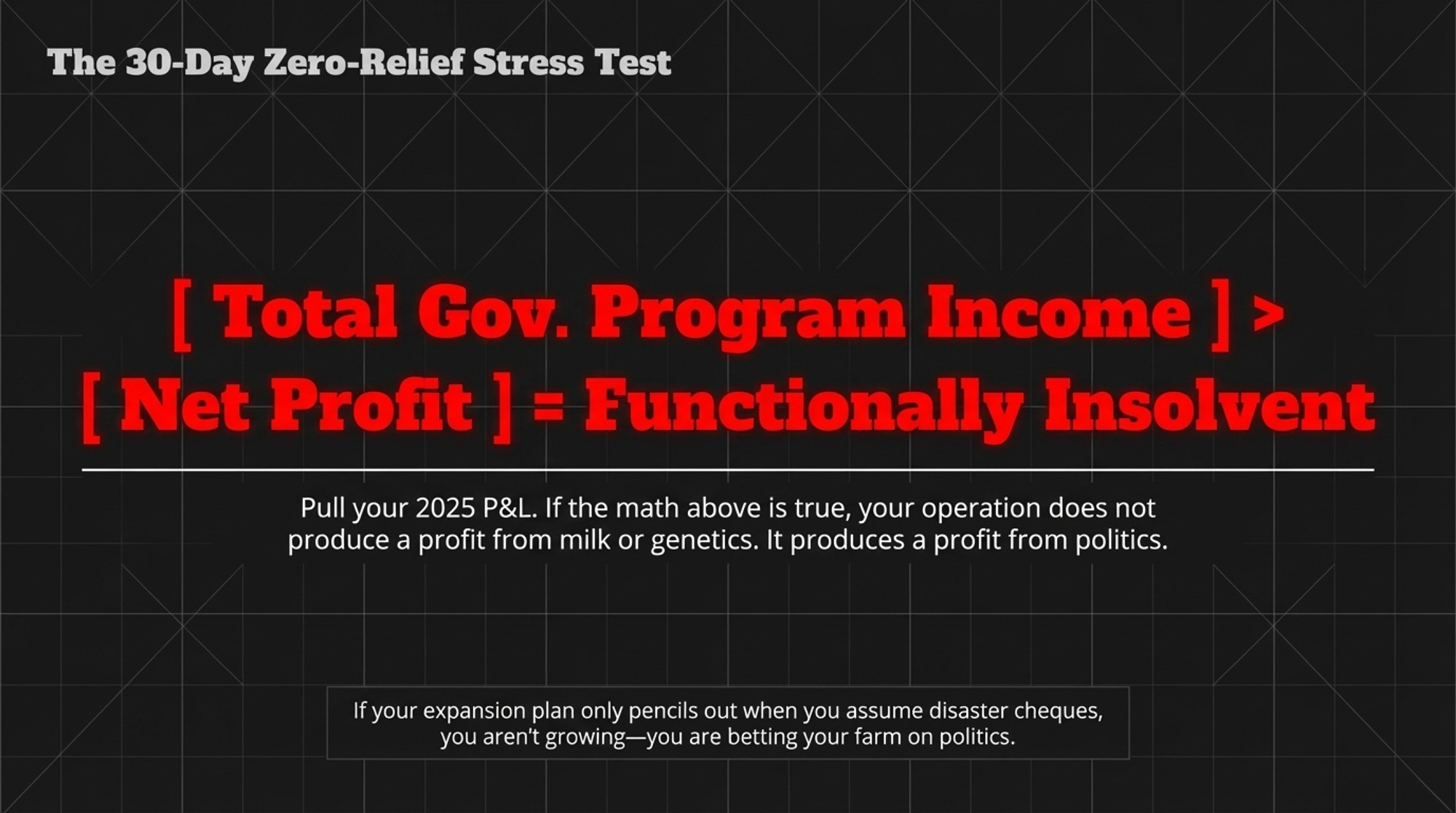 If your government‑program income is larger than your net profit, you are functionally insolvent without subsidies. Not “benefiting from programs.” Not “leveraging a safety net.” Insolvent on a cash‑flow basis. Your operation, as currently structured, does not produce a profit from milk, genetics, or any product you actually sell. It produces a profit from politics.