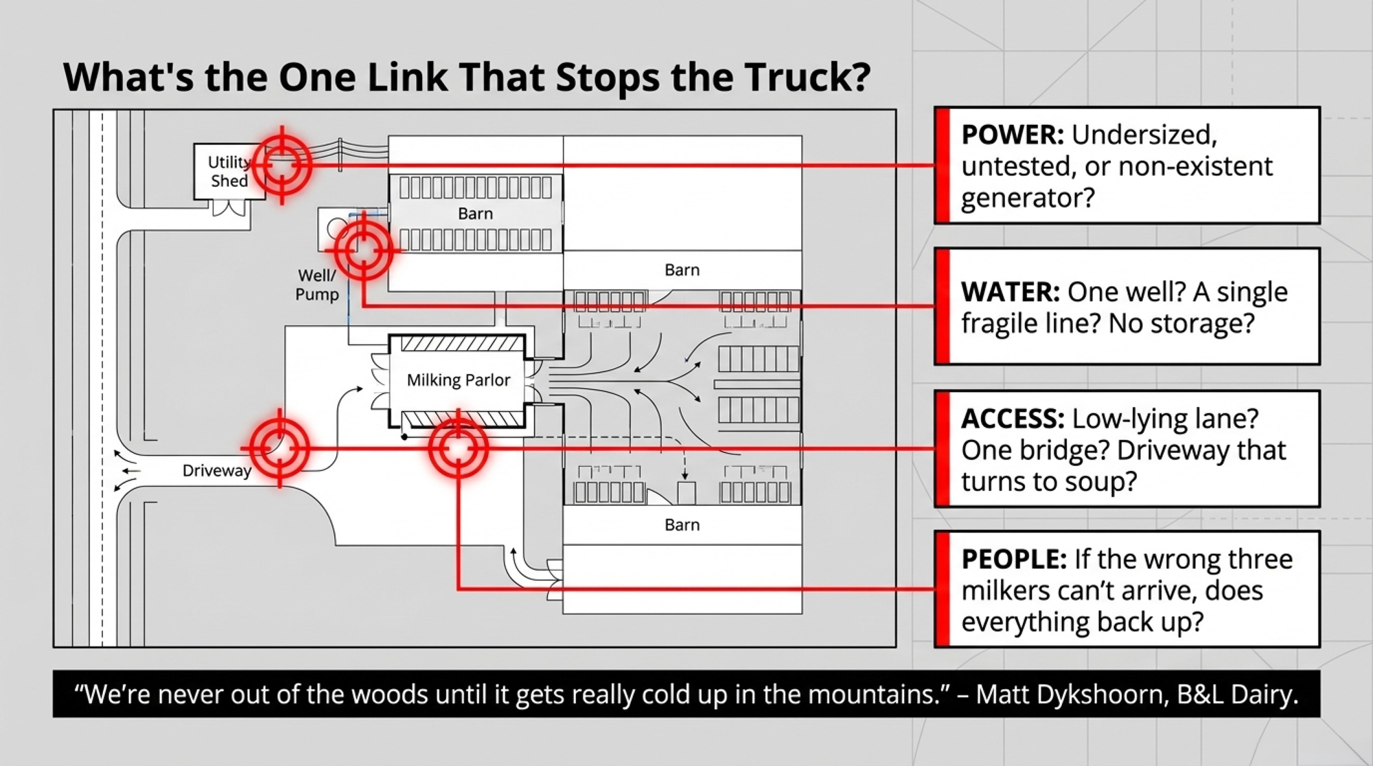 On the management side, there’s a question that cuts through the noise: “What’s the one thing on this farm that, if it failed during a storm, flood, fire, or long power outage, would stop us milking or stop the truck from getting here?”
